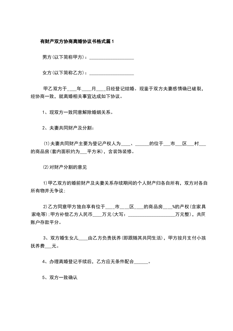 1、【存款】双方婚姻关系存续期间,目前共有存款____元,其中男方账户____元,女方账户____元,双方同意,____方在本协议签订之日起3日内给付____方____元。