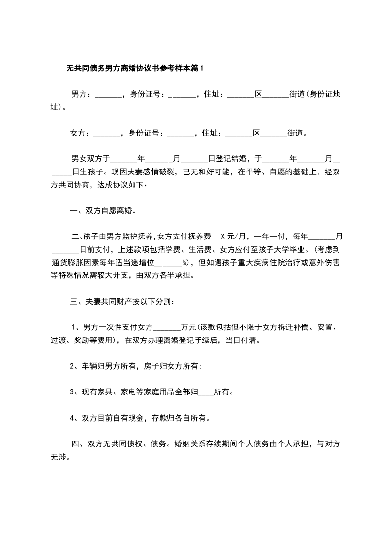 无共同债务男方离婚协议书参考样本篇9