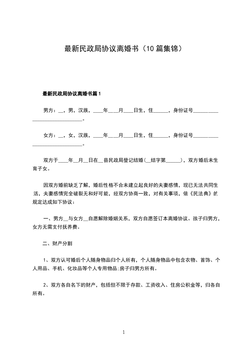 男方与女方于_________年_________月_________日在_________省登记结婚。双方夫妻感情确已破裂,已无和好可能,双方自愿离婚。现根据《民法典》的有关规定,经男女双方自愿协商,达成协议如下: