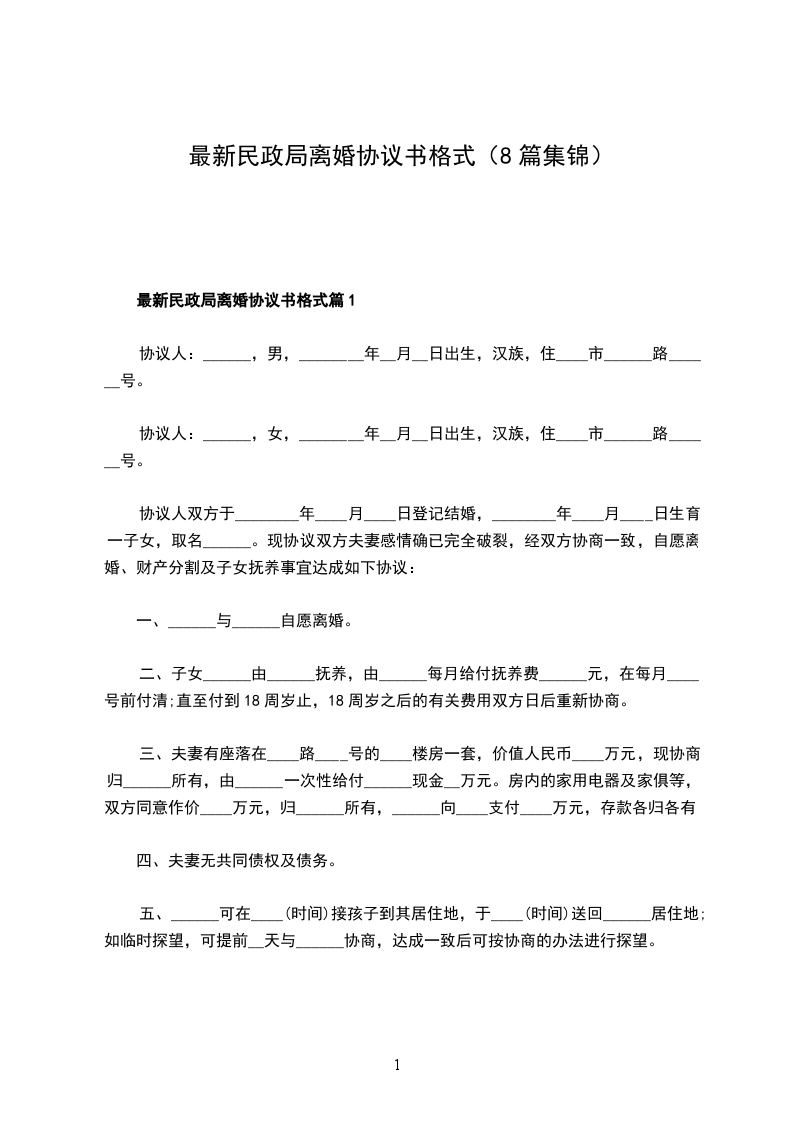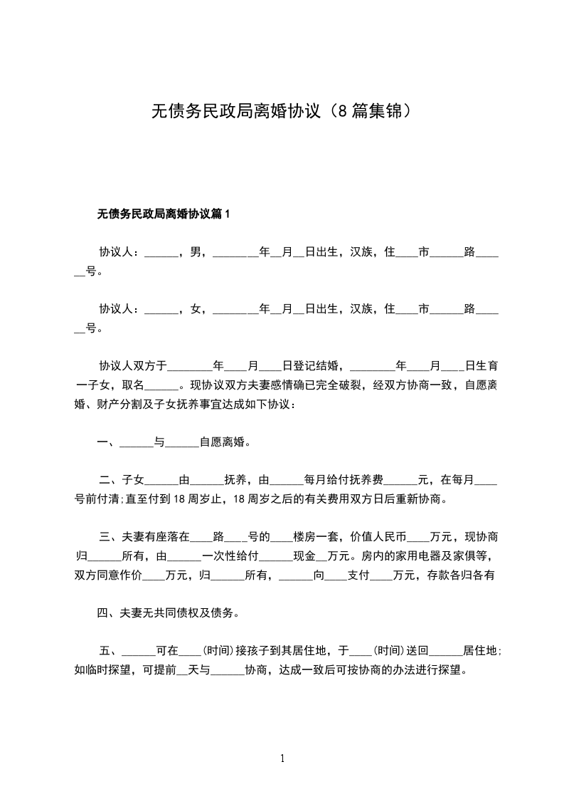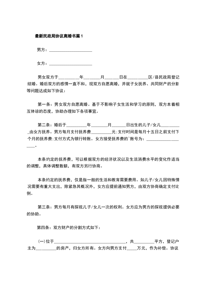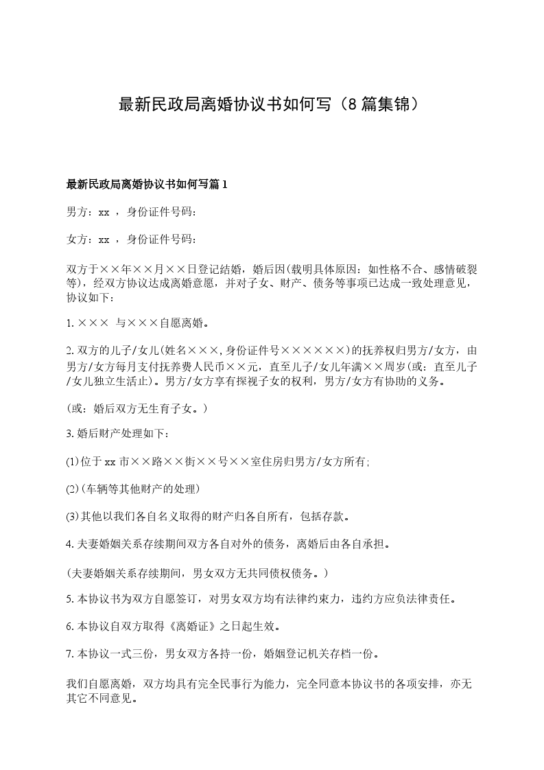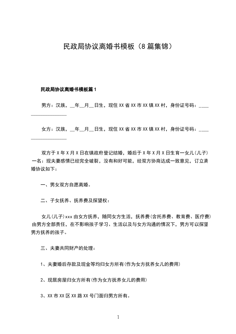 八、本协议一式三份,男、女双方各执一份,婚姻登记机关存档一份,自婚姻登记机颁发《离婚证》之日起生效。九、如本协议生效后在执行中发生争议的,双方应协商解决,协商不成,任何一方均可向相关人民法院起诉。