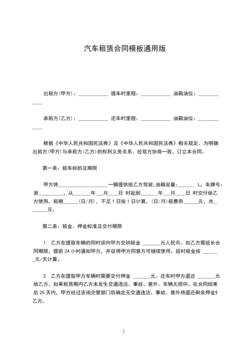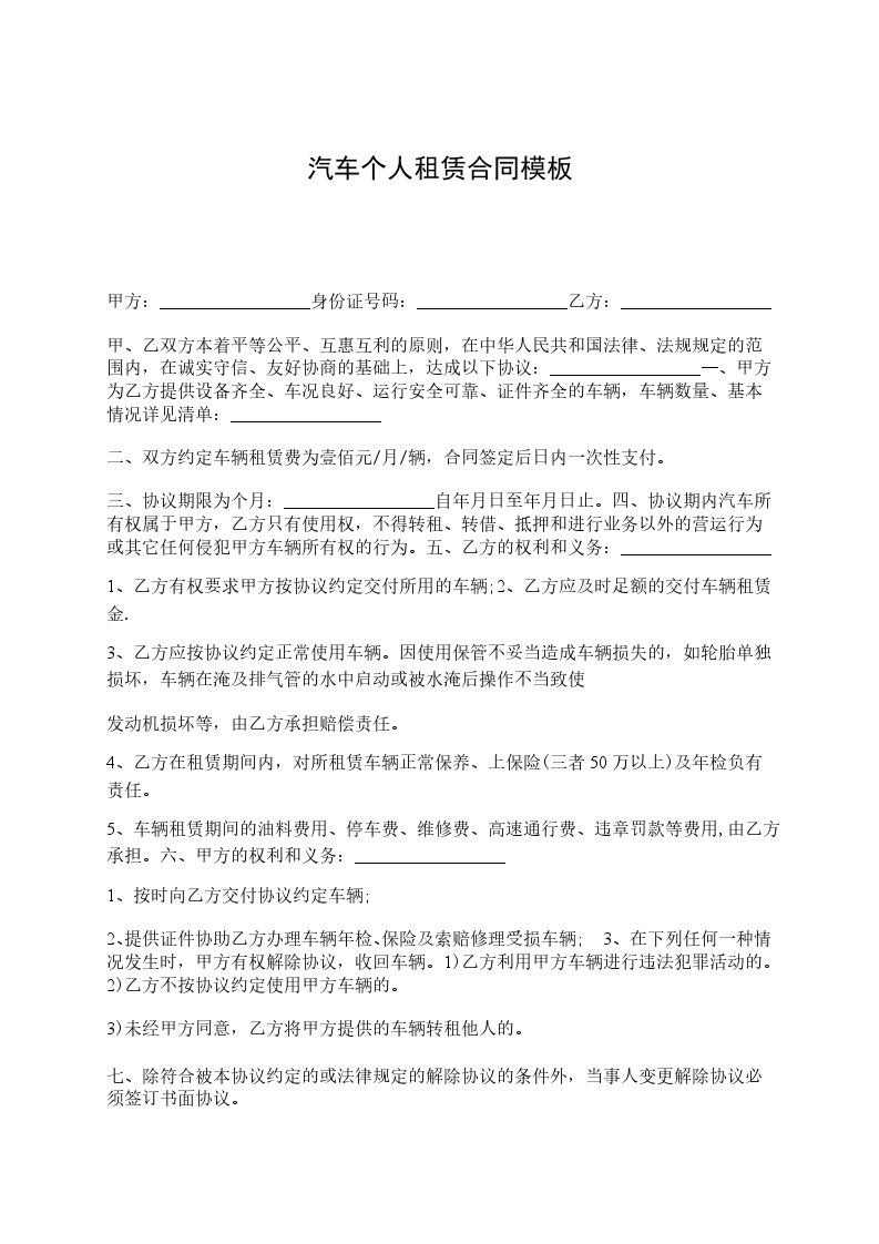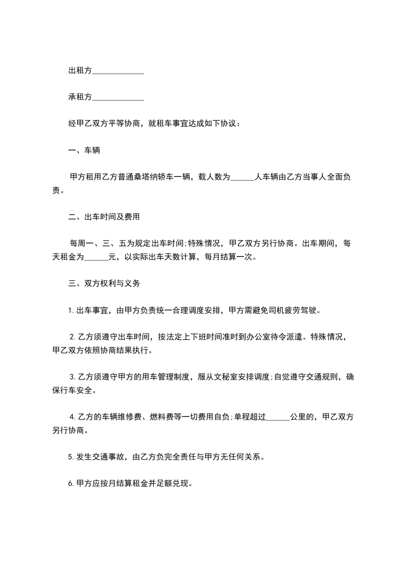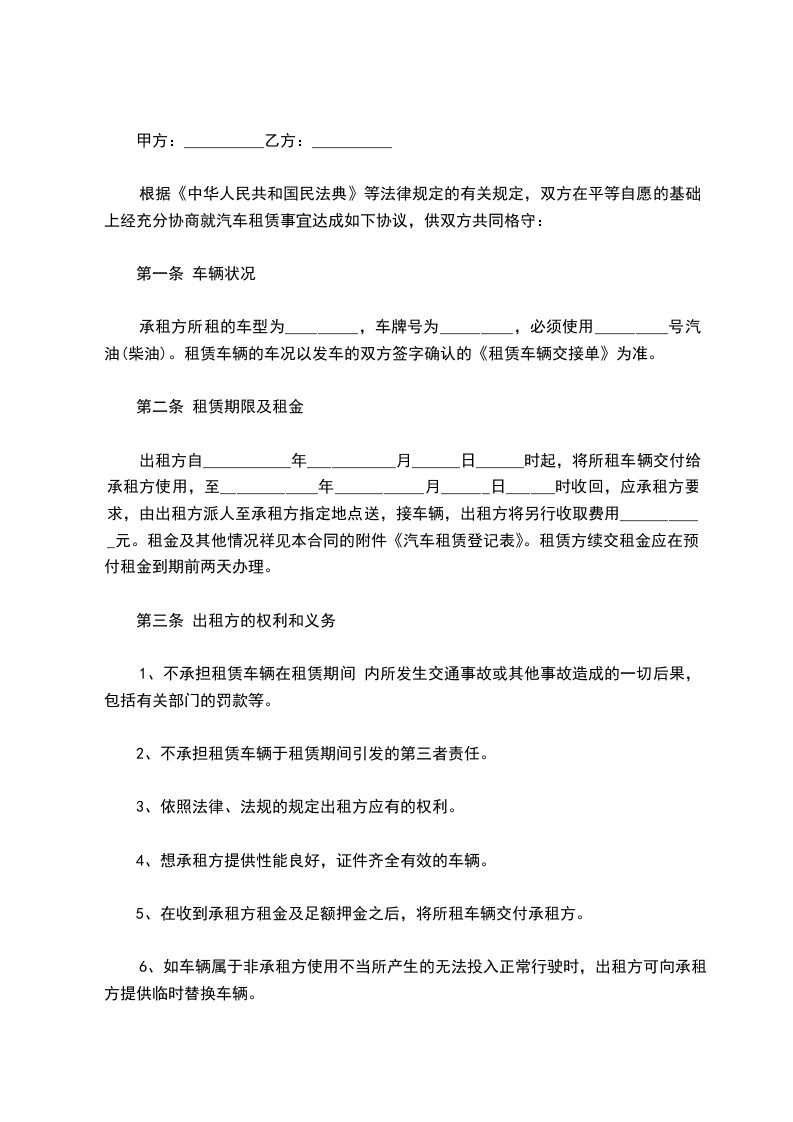 承租方所租的车型为_________,车牌号为_________,必须使用_________号汽油(柴油)。租赁车辆的车况以发车的双方签字确认的《租赁车辆交接单》为准。
