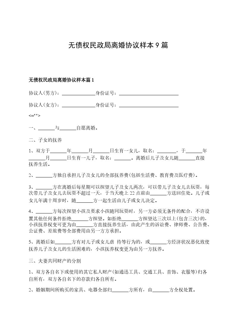 无债务民政局常用离婚协议模板篇9