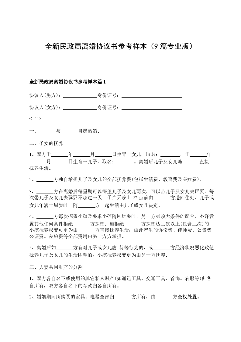 九、本协议一式三份,自婚姻登记处颁发离婚证之日起生效,男、女双方各执一份,婚姻登记机关存档一份。