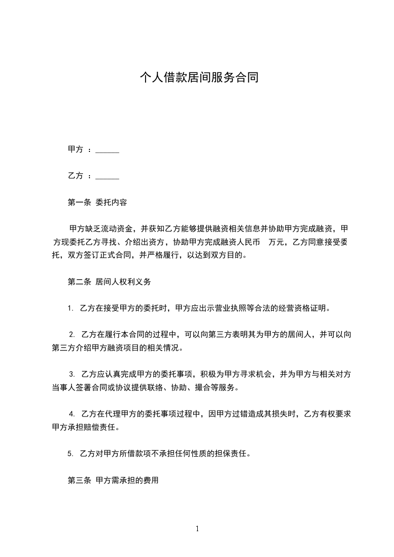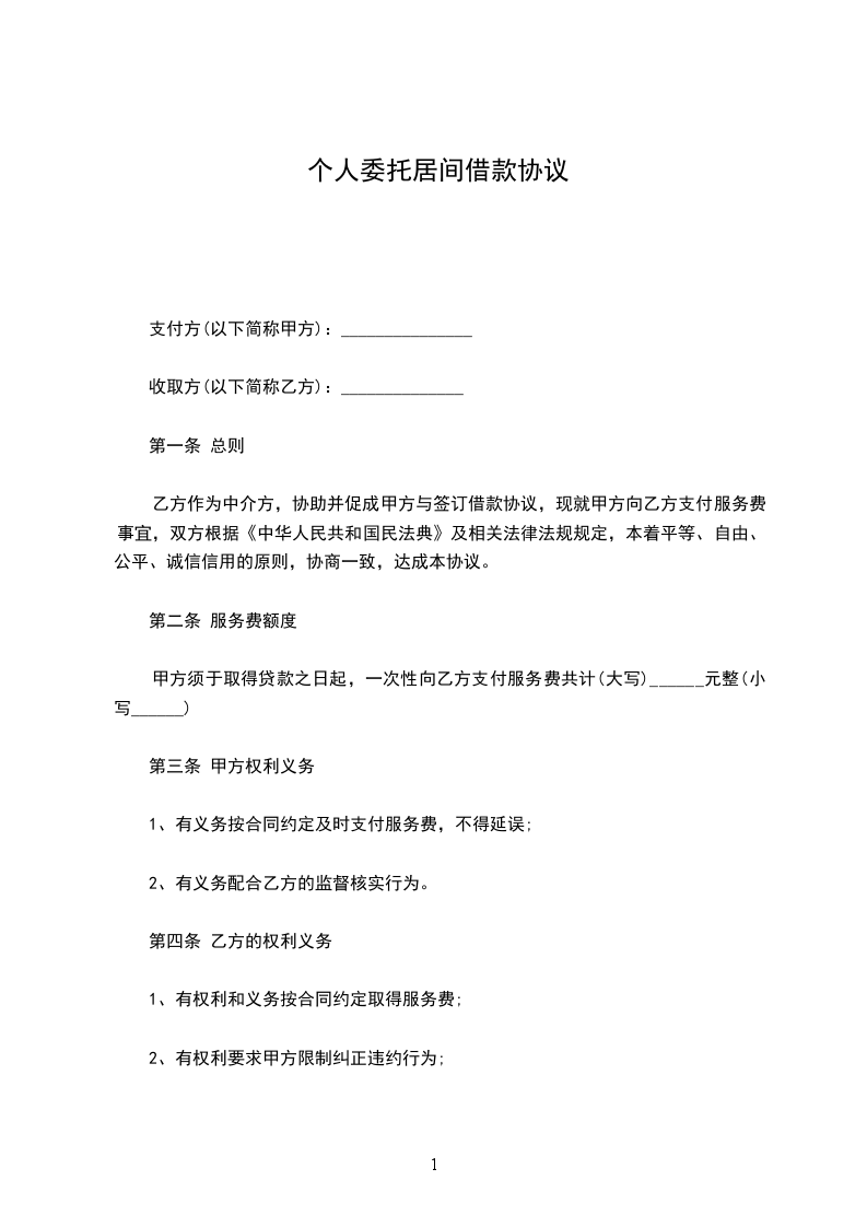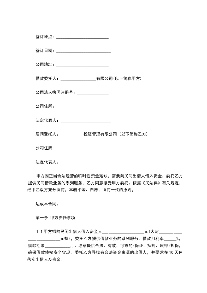 1.1甲方拟向民间出借人借入资金人____________________元(大写__________________________元整),委托乙方提供借款业务的系列服务。借款月利率______%,借款期限____________月。愿意提供合法、有效、可靠的(保证、抵押、质押)担保,确保借款债权安全实现。委托乙方寻找有合法资金来源的出借人,并要求在10天内落实出借人及资金。