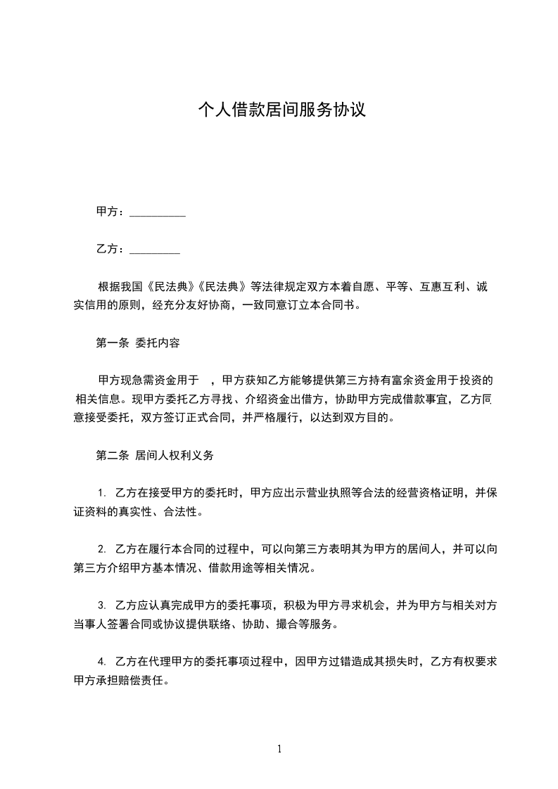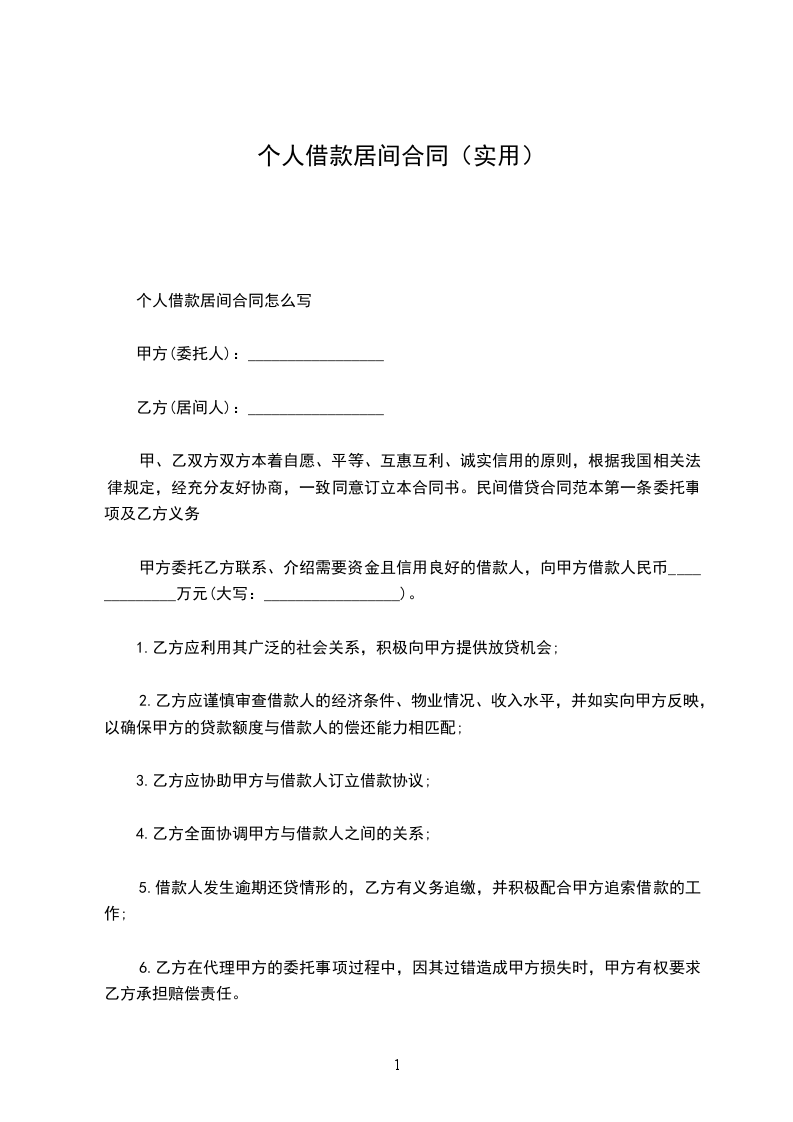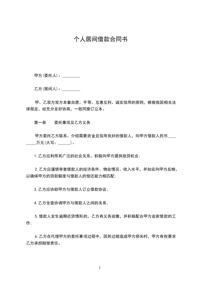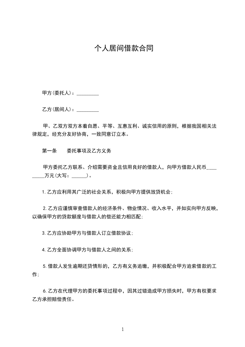 1.1甲方拟向民间出借人借入资金人____________________元(大写__________________________元整),委托乙方提供借款业务的系列服务。借款月利率______%,借款期限____________月。愿意提供合法、有效、可靠的(保证、抵押、质押)担保,确保借款债权安全实现。委托乙方寻找有合法资金来源的出借人,并要求在10天内落实出借人及资金。
