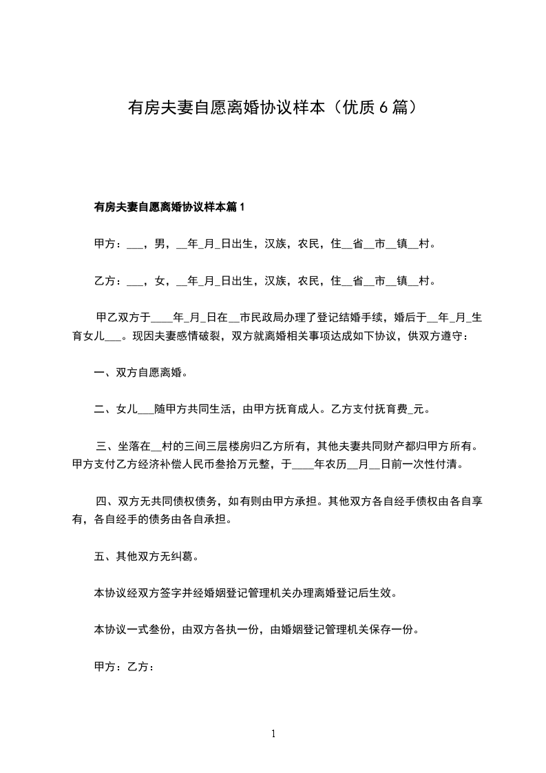 (一)位于___________________________________,共__________平方,登记户主为__________的房产,归女方所有。女方向男方支付_____万元,作为补偿。协议经登记生效后,女方应于30日内,向男方支付完毕;男方应在30日内,配合女方将房产过户到女方名下。
