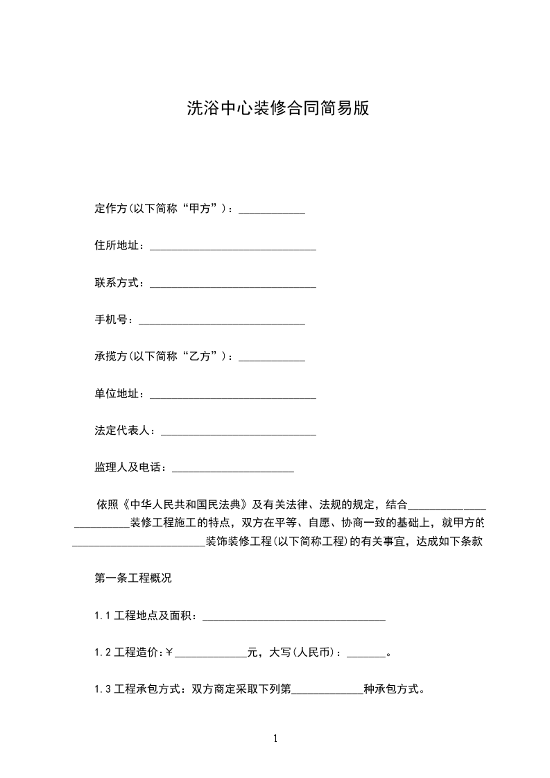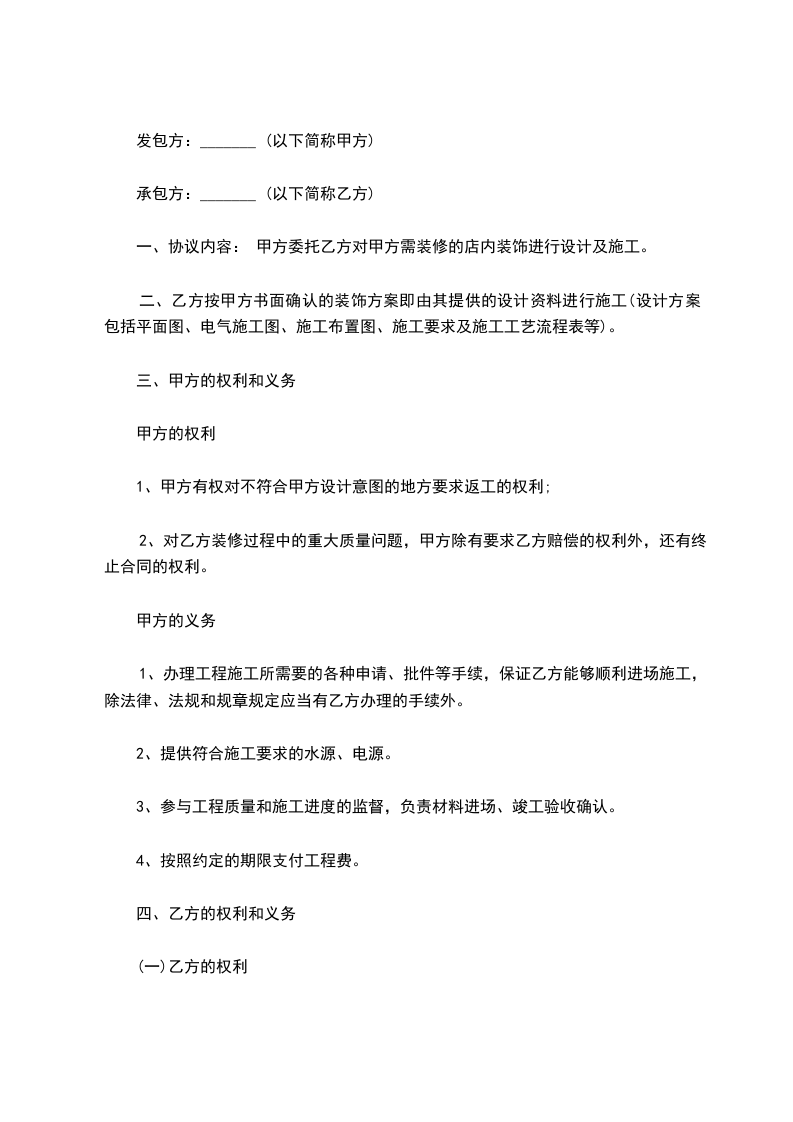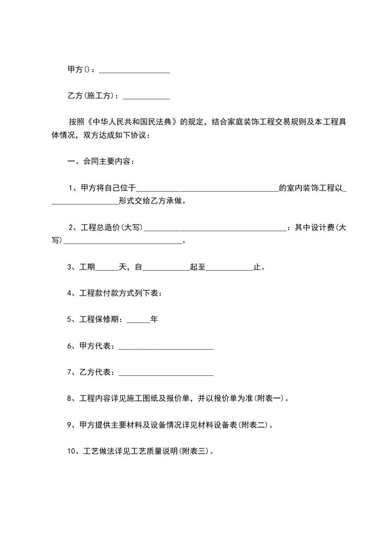 依照《中华人民共和国民法典》及有关法律、法规的规定,结合______________________装饰装修工程施工的特点,双方在平等、自愿、协商一致的基础上,就甲方的______________________装饰装修工程(以下简称工程)的有关事宜,达成如下条款: