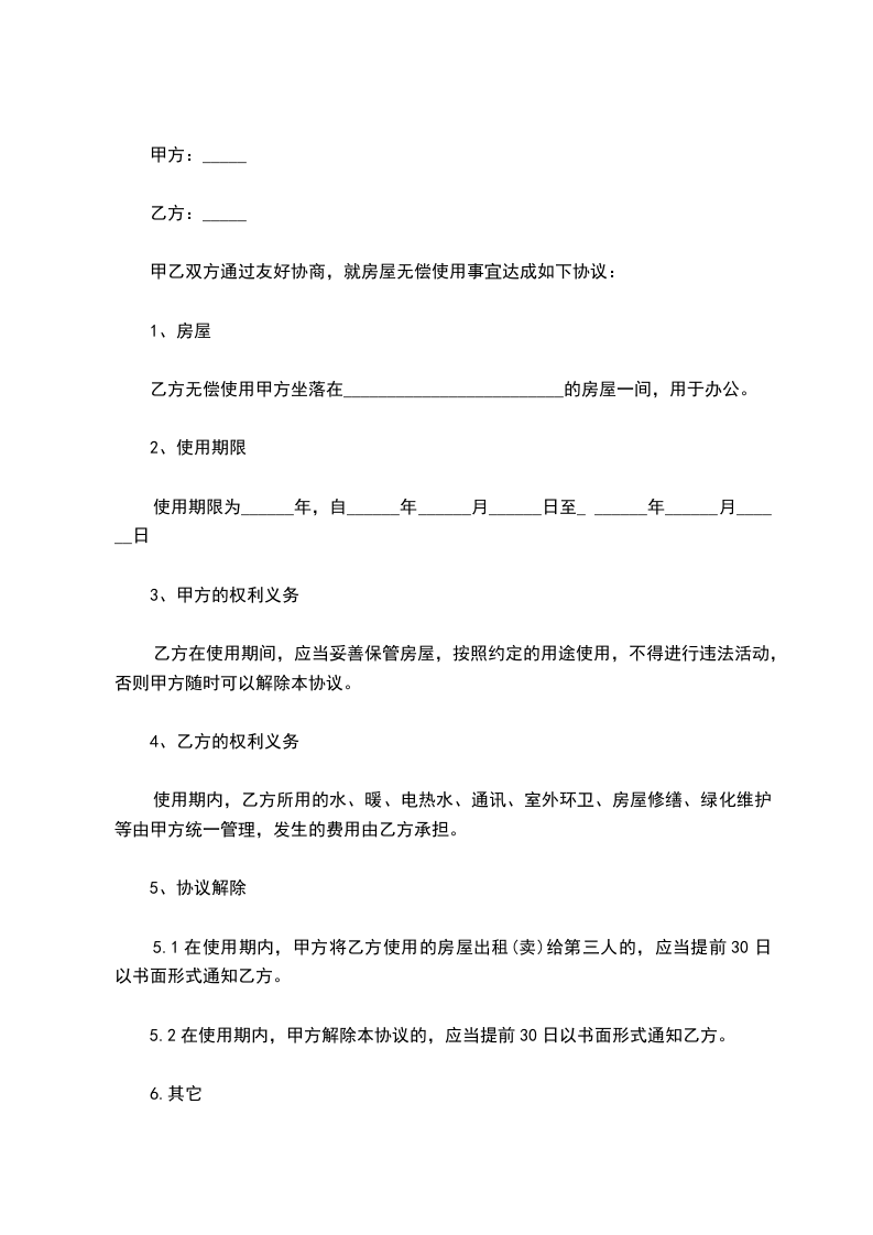 甲乙双方通过友好协商,就房屋无偿使用事宜达成如下协议: