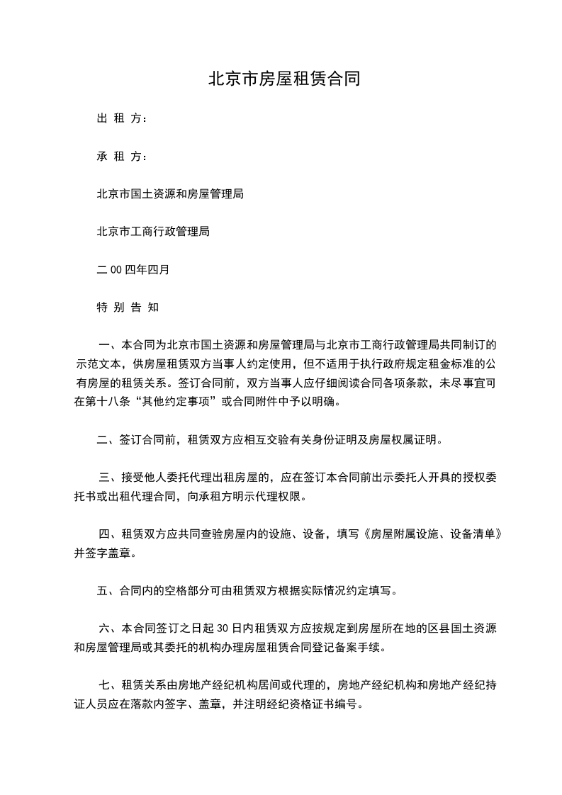 一、本合同为北京市国土资源和房屋管理局与北京市工商行政管理局共同制订的示范文本,供房屋租赁双方当事人约定使用,但不适用于执行政府规定租金标准的公有房屋的租赁关系。签订合同前,双方当事人应仔细阅读合同各项条款,未尽事宜可在第十八条“其他约定事项”或合同附件中予以明确。