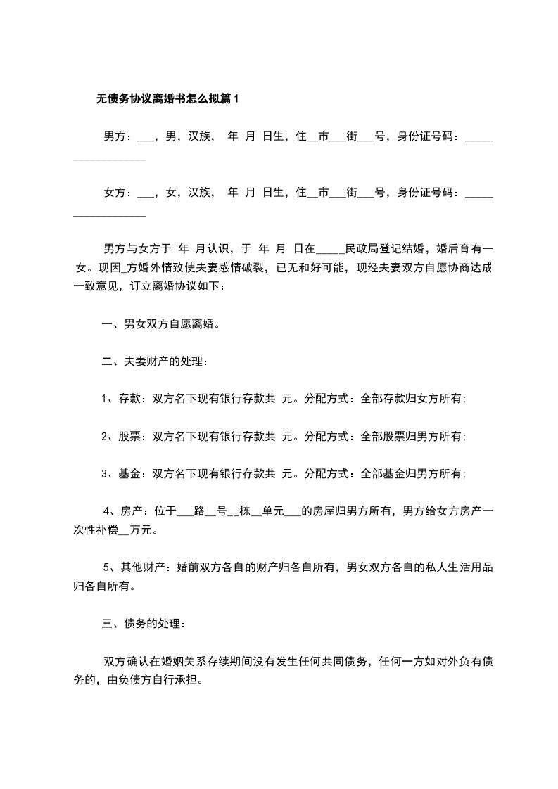 无债务协议离婚书怎么拟篇3
