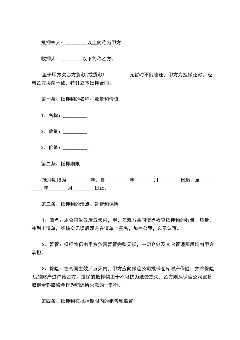 2、暂管:抵押物仍由甲方负责暂管完整无损,一切仓储及其它管理费用均由甲方承担。