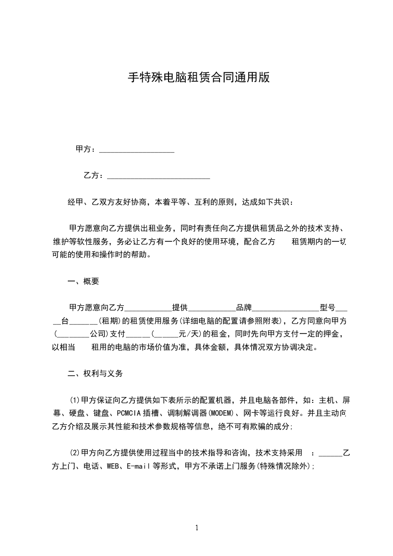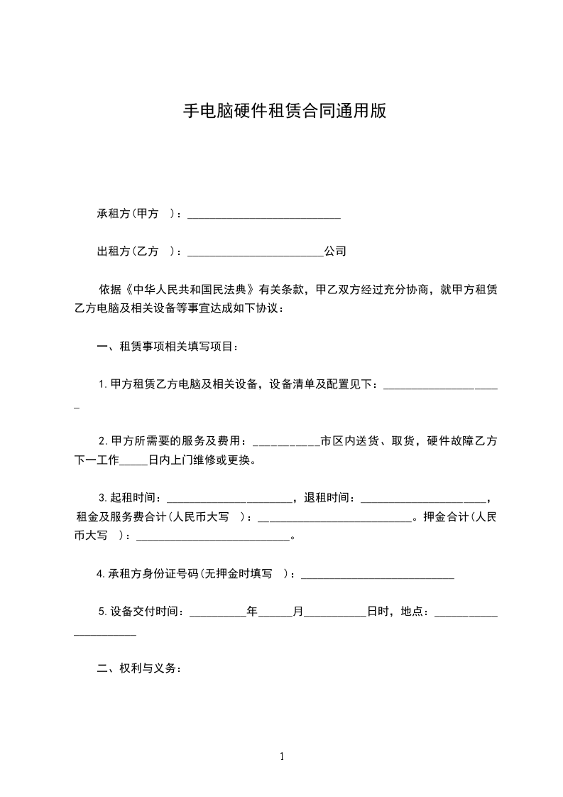 二、起租时间:____________年____________月____________日,退租时间:____________年____________月____________日。在合同签订之日,乙方需向甲方支付电脑押金(大写)________,租金(大写)_________。如续租,请提前3天通知甲方,并重新办理租赁手续。