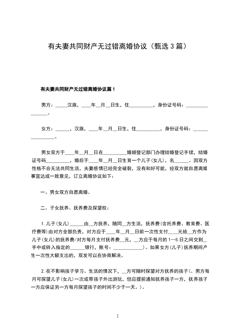 有夫妻共同财产无过错离婚协议篇1
