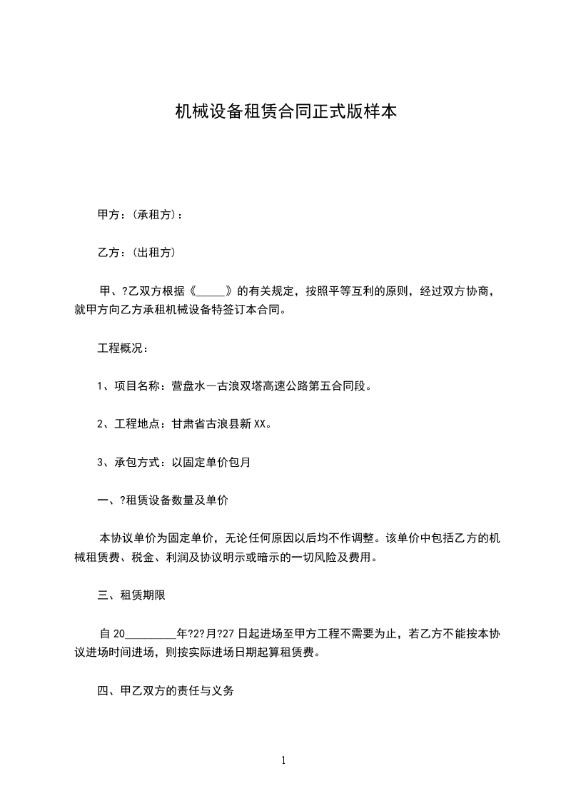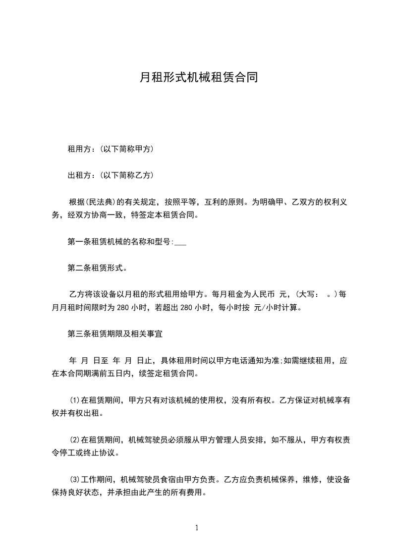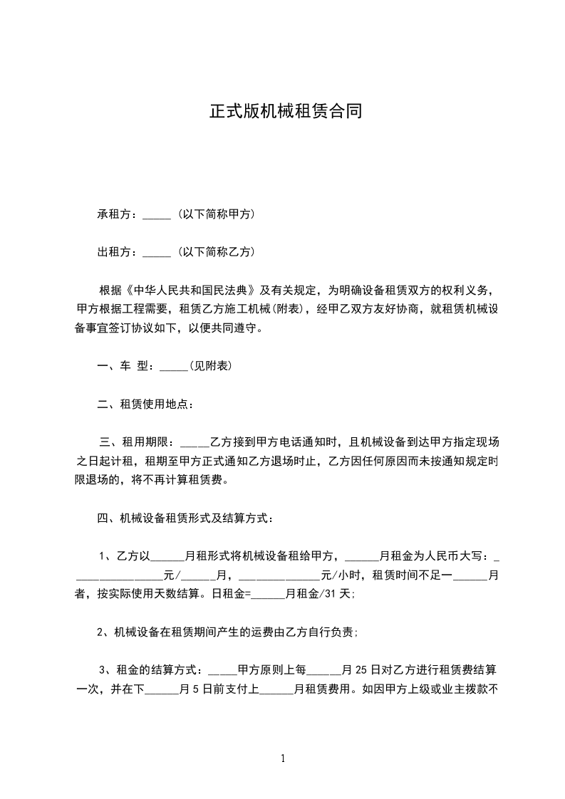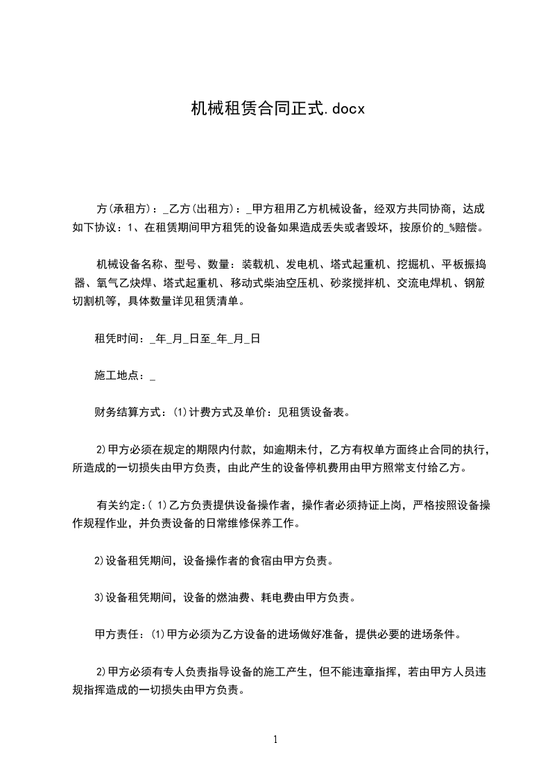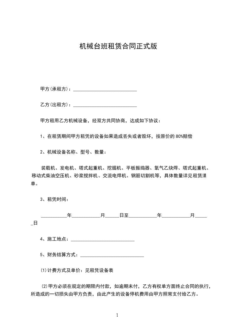 甲方租用乙方机械设备,经双方共同协商,达成如下协议:
