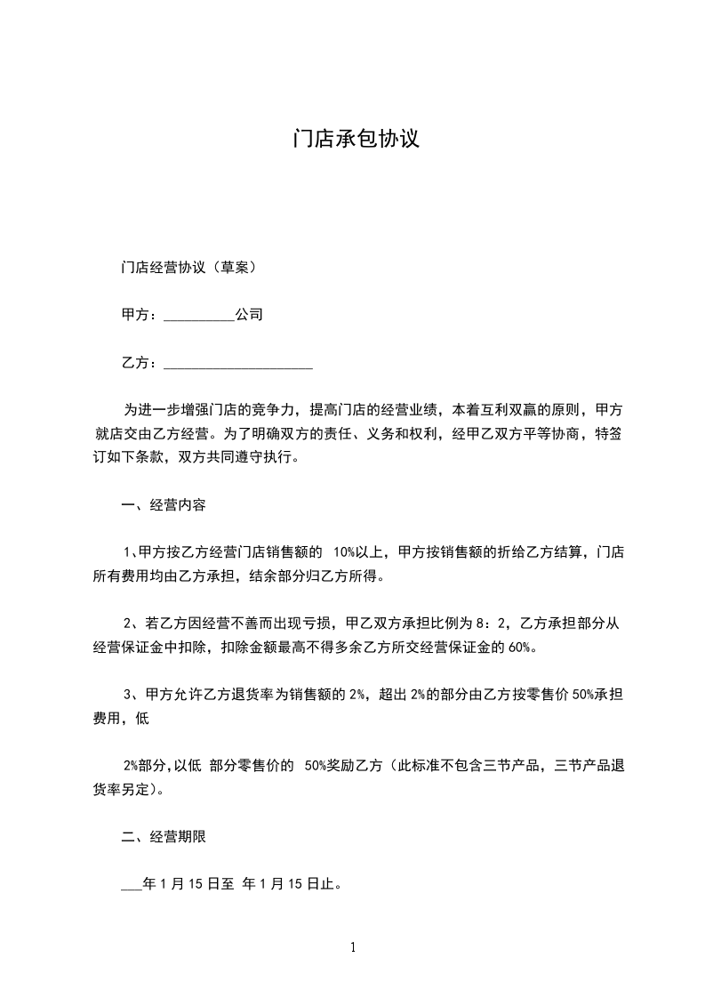 1、甲方按乙方经营门店销售额的10%以上,甲方按销售额的折给乙方结算,门店所有费用均由乙方承担,结余部分归乙方所得。