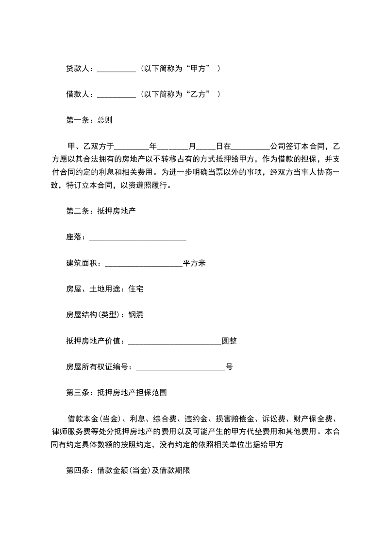 甲、乙双方于_________年________月_____日在__________公司签订本合同,乙方愿以其合法拥有的房地产以不转移占有的方式抵押给甲方,作为借款的担保,并支付合同约定的利息和相关费用。为进一步明确当票以外的事项,经双方当事人协商一致,特订立本合同,以资遵照履行。