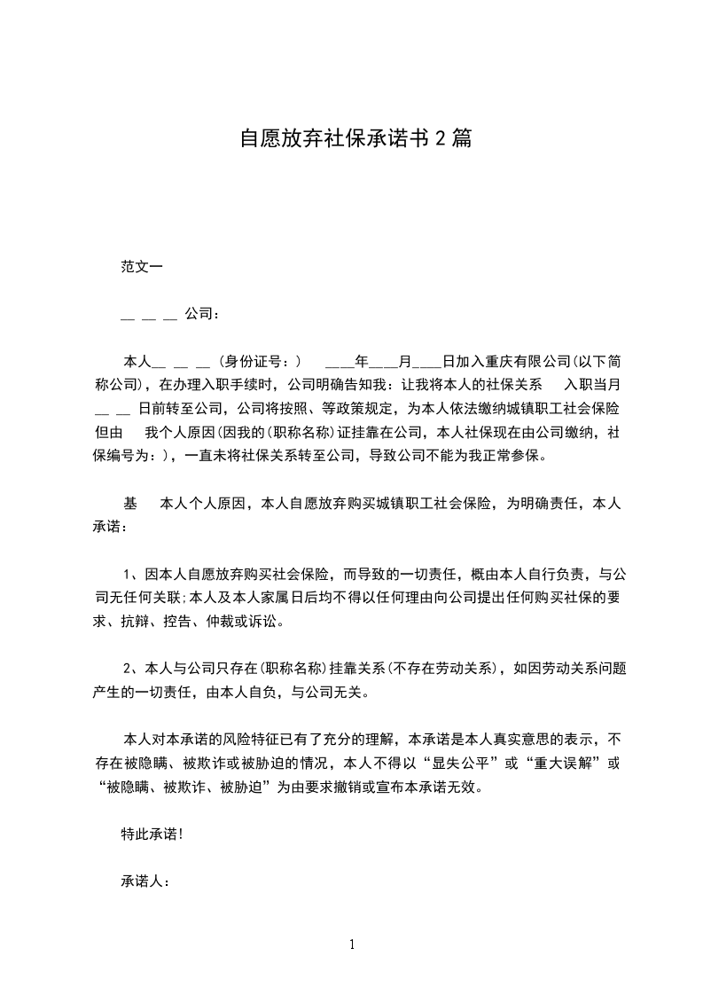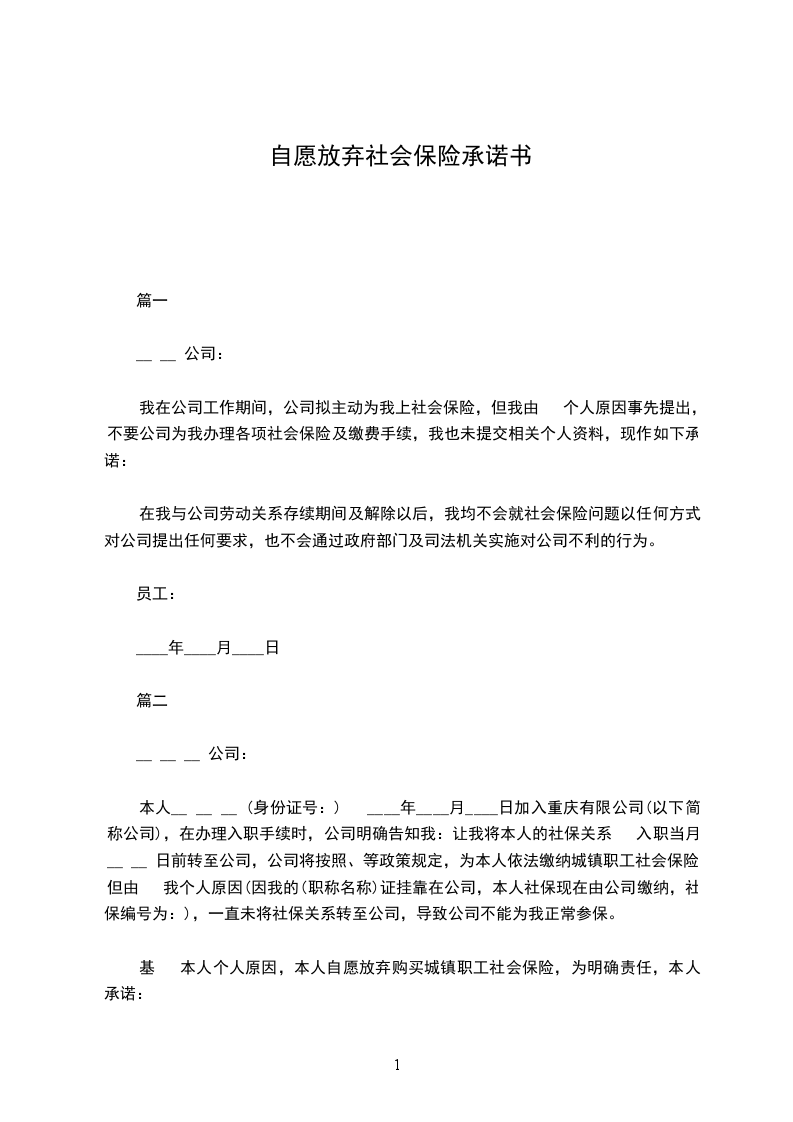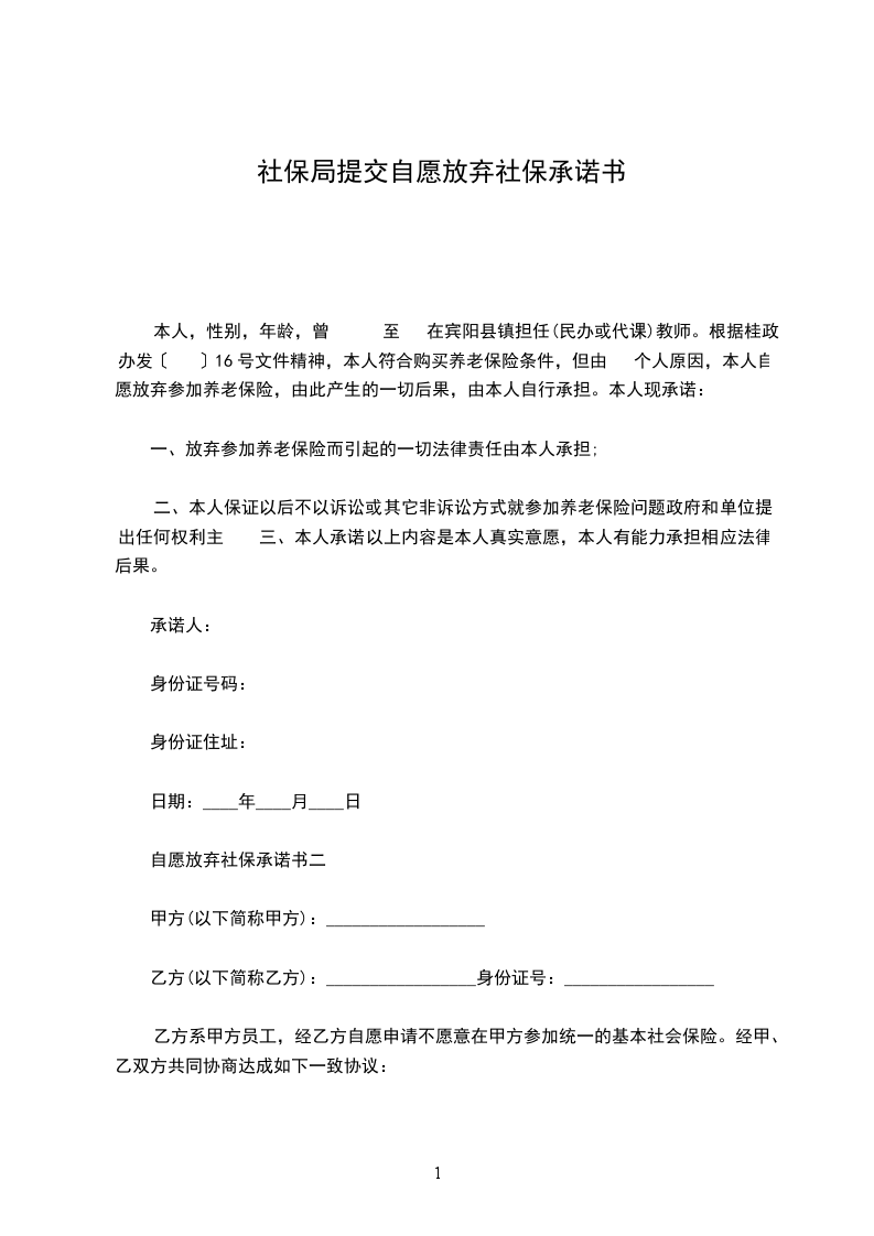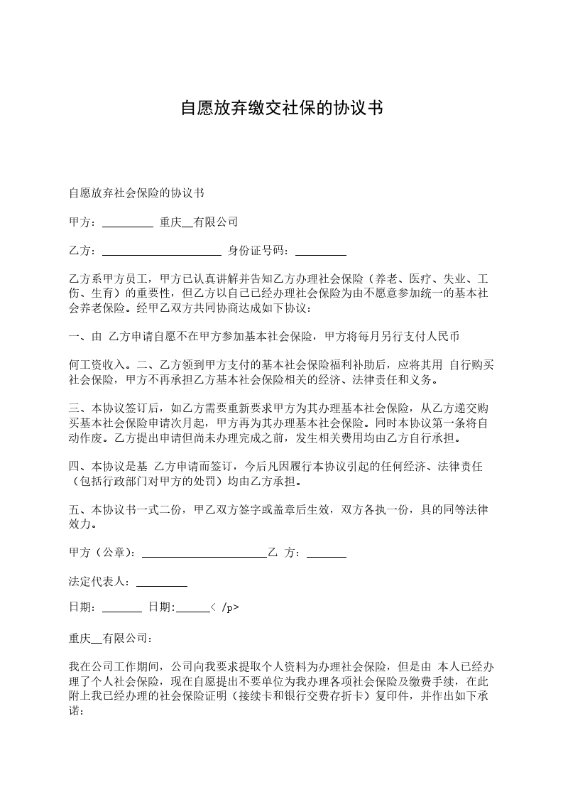 一、经乙方申请,甲方同意不强制为甲方在社保机构统一办理 年12月份当月社会保险。而由乙方自行决定或以个人名义在户籍所在地参加社保,或在户籍所在地参加农村新型养老保险和合作医疗保险或其他保险。因此造成的法律责任与经济损失(包括相关部门对甲方的处罚)一律由乙方承担。