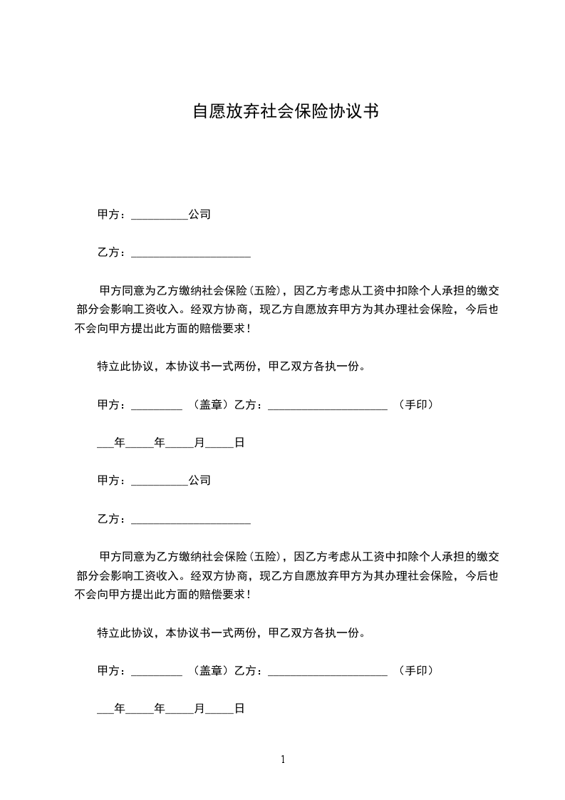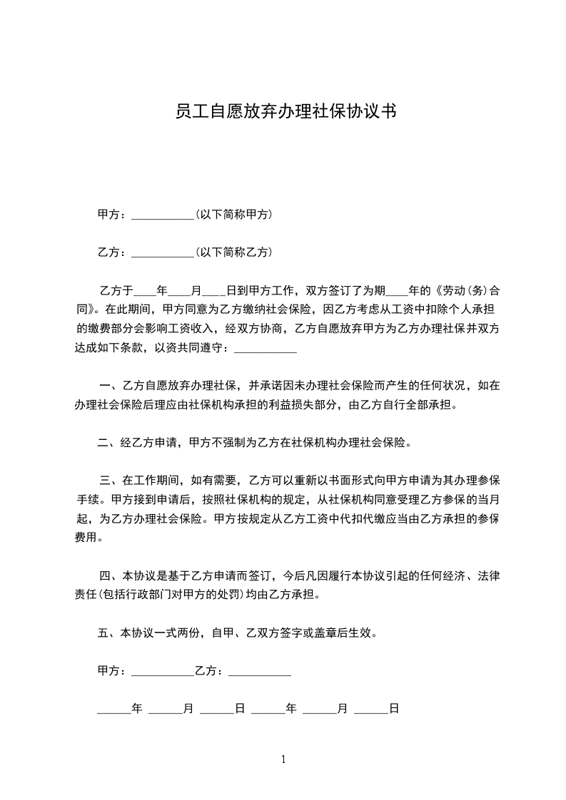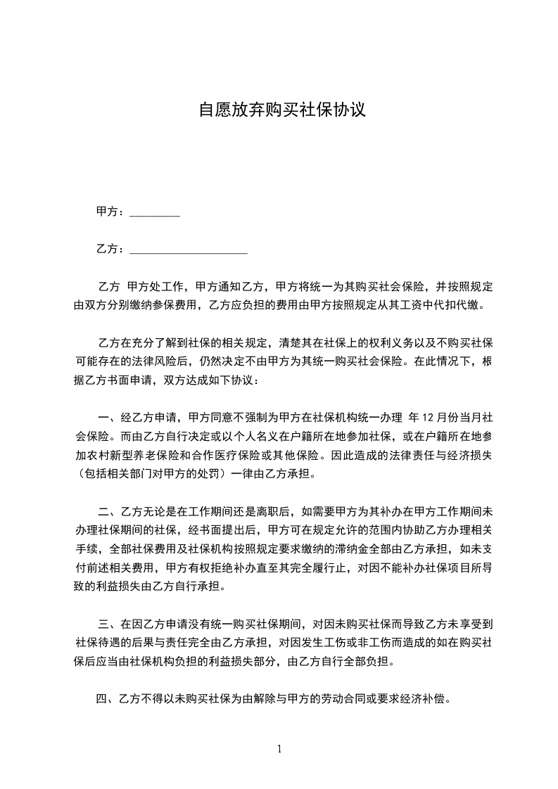 乙方在充分了解到社保的相关规定,清楚其在社保上的权利义务以及不购买社保可能存在的法律风险后,仍然决定不由甲方为其统一购买社会保险。在此情况下,根据乙方书面申请,双方达成如下协议: