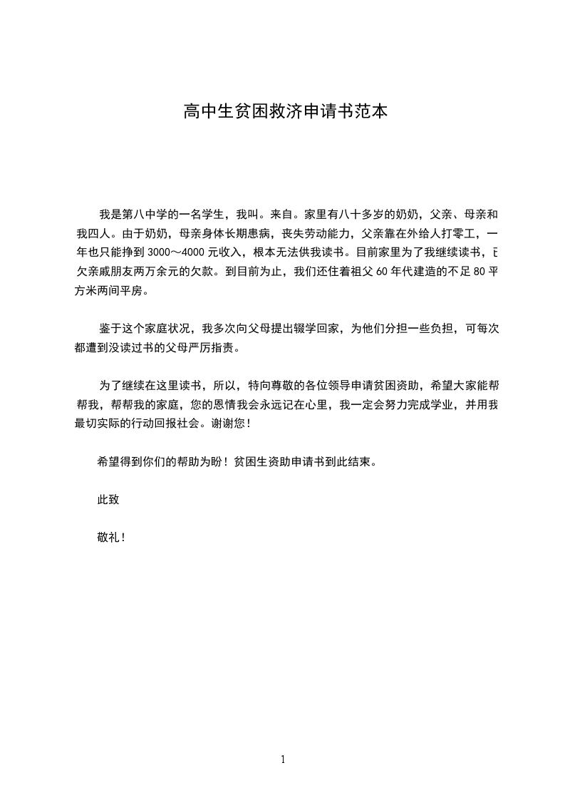 我是第八中学的一名学生,我叫。来自。家里有八十多岁的奶奶,父亲、母亲和我四人。由于奶奶,母亲身体长期患病,丧失劳动能力,父亲靠在外给人打零工,一年也只能挣到3000~4000元收入,根本无法供我读书。目前家里为了我继续读书,已欠亲戚朋友两万余元的欠款。到目前为止,我们还住着祖父60年代建造的不足80平方米两间平房。