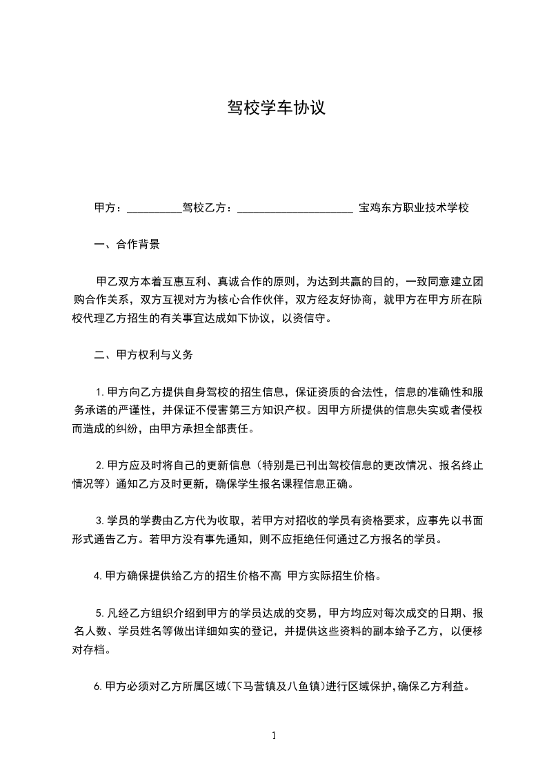 1.乙方(宝鸡东方职业技术学校)利用自身的学校招生用地为乙方开设驾校品牌专区,为乙方进行招生工作。