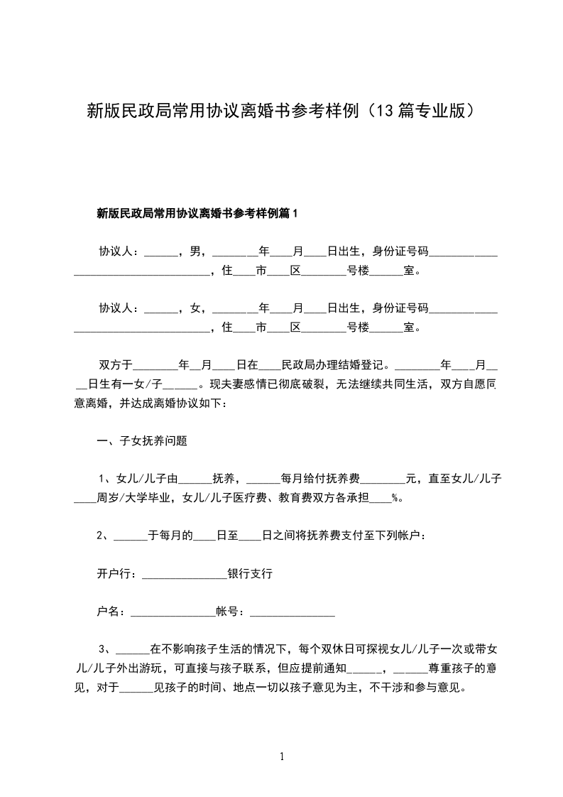 九、本协议一式三份,自婚姻登记处颁发离婚证之日起生效,男、女双方各执一份,婚姻登记机关存档一份。