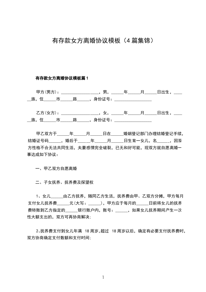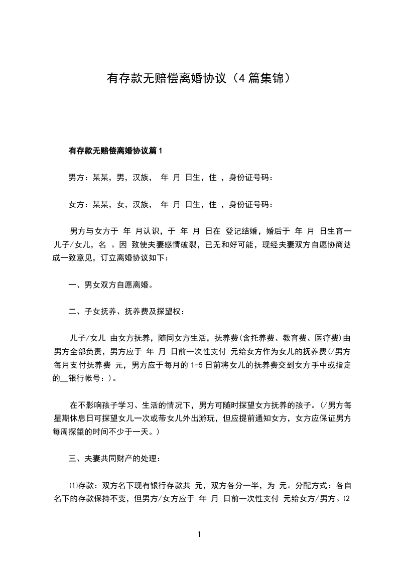1.存款:双方名下现有银行存款共元,双方各分一半,为元。分配方式:各自名下的存款保持不变,但男方/女方应于年月日前一次性支付元给女方/男方。