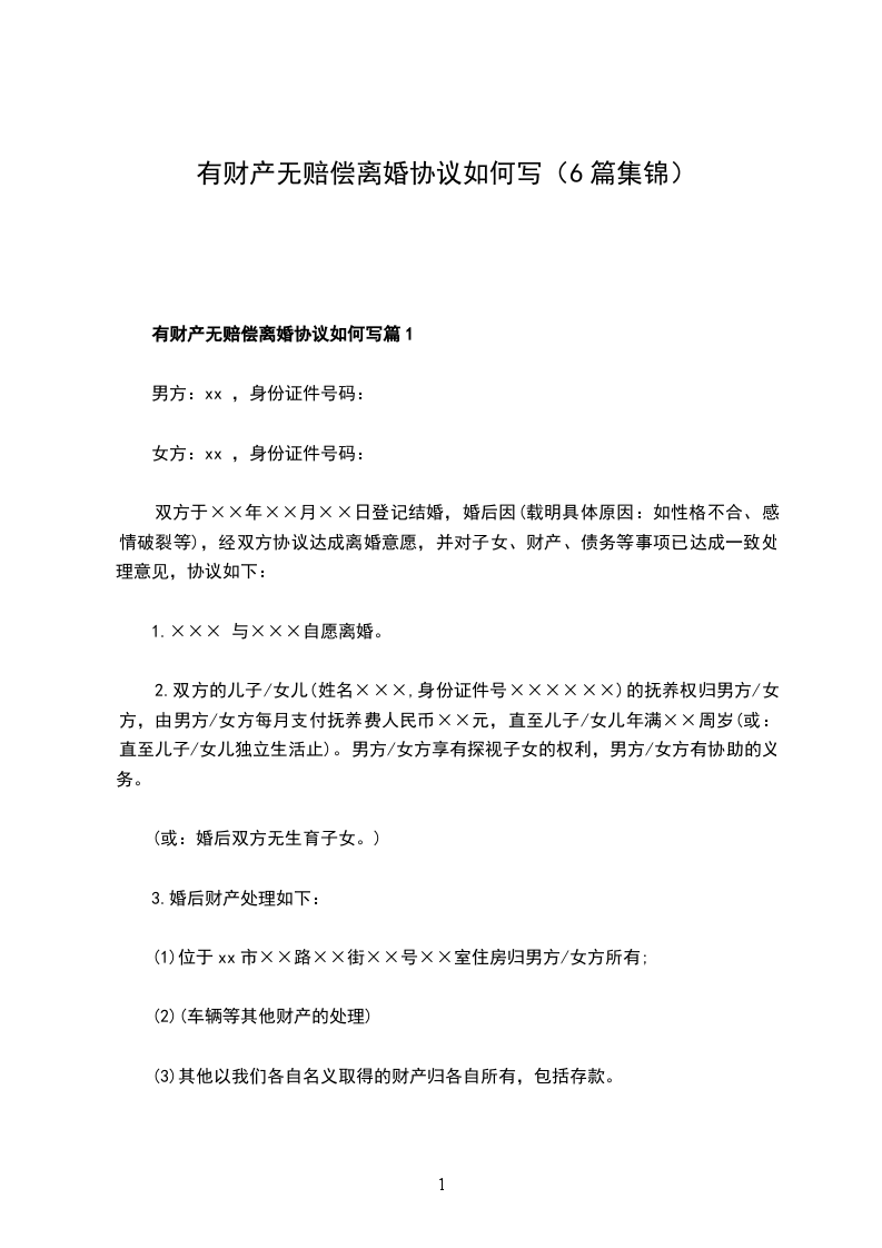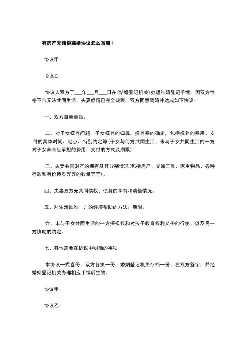 有房产无赔偿离婚协议怎么写篇6