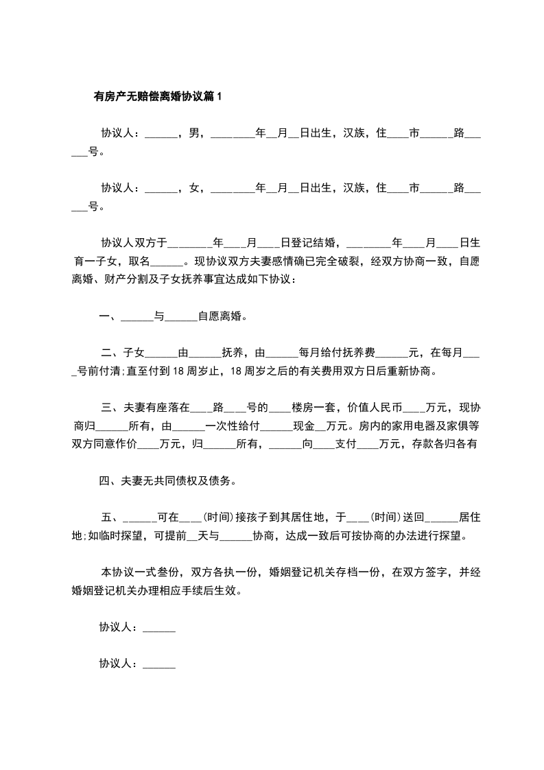 有房产无赔偿离婚协议怎么写篇5