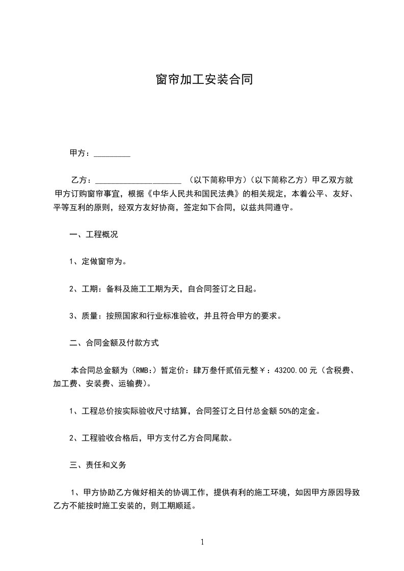 一、安装72道窗子的窗帘,每道110元,合计7920元(大写:柒仟玖佰贰拾圆整)。本合同总价已包括材料、加工制作、运输、检验、安装及税项等全部费用。