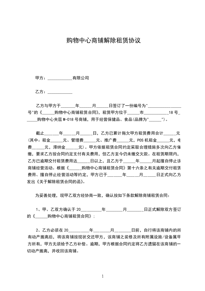 1.若甲方在乙方没有违反本合同的情况下提前解除合同或租给他人,视为甲方违约,负责赔偿违约金_____元。