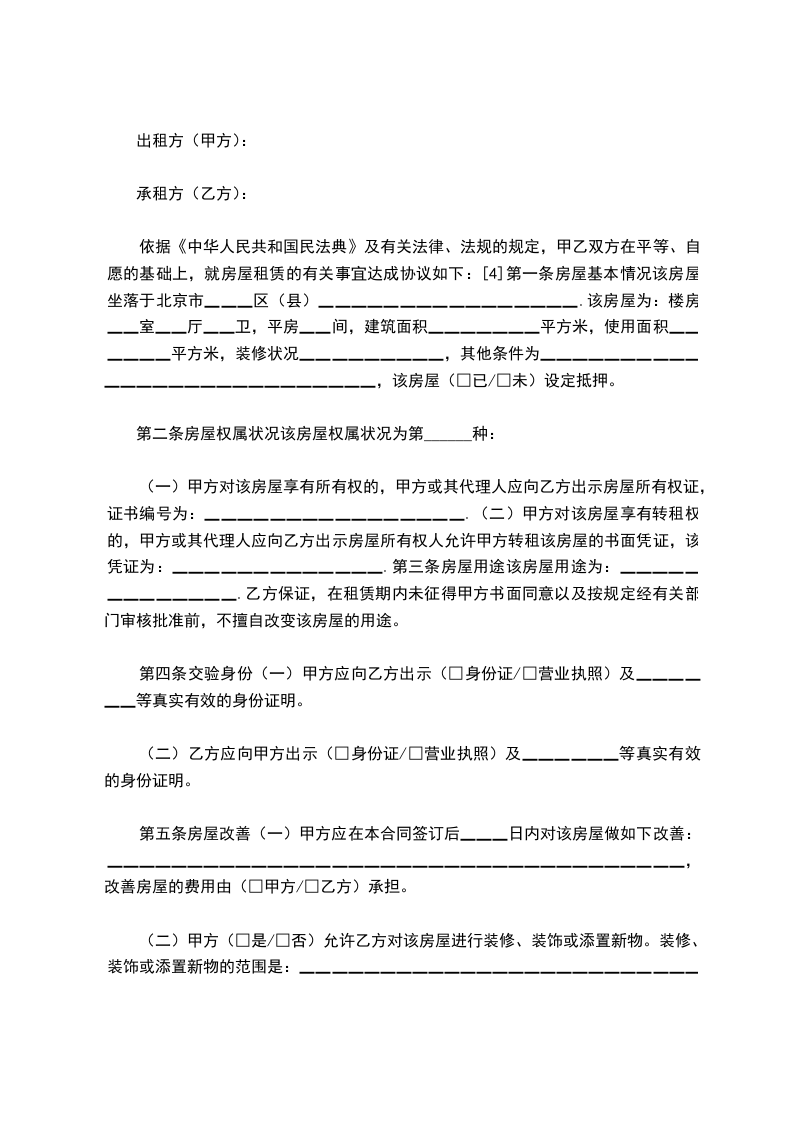 依据《中华人民共和国民法典》及有关法律、法规的规定,甲乙双方在平等、自愿的基础上,就房屋租赁的有关事宜达成协议如下:[4]第一条房屋基本情况该房屋坐落于北京市▁▁▁区(县)▁▁▁▁▁▁▁▁▁▁▁▁▁▁▁▁.该房屋为:楼房▁▁室▁▁厅▁▁卫,平房▁▁间,建筑面积▁▁▁▁▁▁▁平方米,使用面积▁▁▁▁▁▁平方米,装修状况▁▁▁▁▁▁▁▁▁,其他条件为▁▁▁▁▁▁▁▁▁▁▁▁▁▁▁▁▁▁▁▁▁▁▁▁▁▁▁,该房屋(□已/□未)设定抵押。