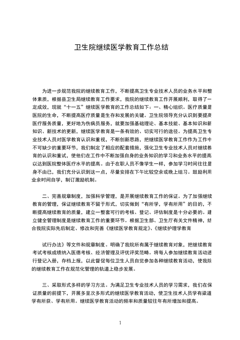 为进一步规范我院的继续教育工作,不断提高卫生专业技术人员的业务水平和整体素质,根据县卫生局继续教育工作要求,我院的继续教育工作开展顺利,取得了一定成效,现就“十一五”继续医学教育的工作总结如下:一、精心组织。医疗质量是医院的生命,不断提高医疗质量是生存和发展的关键。卫生院领导充分认识到要提高医疗服务质量,更好地为伤病员服务,就要加强基础理论、基本技能、基本知识和新知识、新技术的更新,继续医学教育是一条有效的、切实可行的途径。为提高卫生专业技术人员对医学教育认识和重视,不断创新思路,把继续医学教育工作作为工作中不可缺少的重要环节,我们制定了相应的配套措施,强化卫生专业技术人员对继续教育的认识和重试,使他们在工作中不断加强自身的业务知识的学习和业务水平的提高,以达到医院整体医疗水平的提高。由于在职人员不像学生一样,参加学习时间往往是身不由已,我们充分认识到这一点,尽量安排在下午比较空余或晚上组习。鼓励利用业余时间自学,制订激励机制。