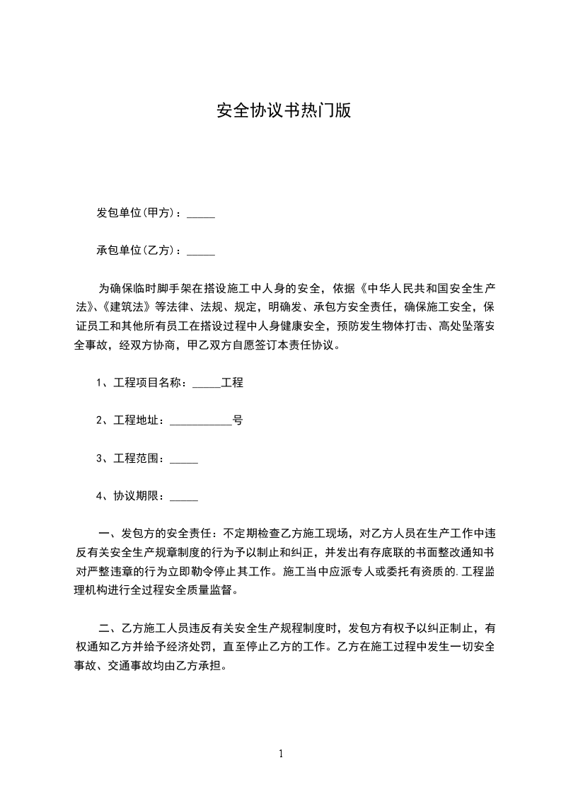 为确保临时脚手架在搭设施工中人身的安全,依据《中华人民共和国安全生产法》、《建筑法》等法律、法规、规定,明确发、承包方安全责任,确保施工安全,保证员工和其他所有员工在搭设过程中人身健康安全,预防发生物体打击、高处坠落安全事故,经双方协商,甲乙双方自愿签订本责任协议。