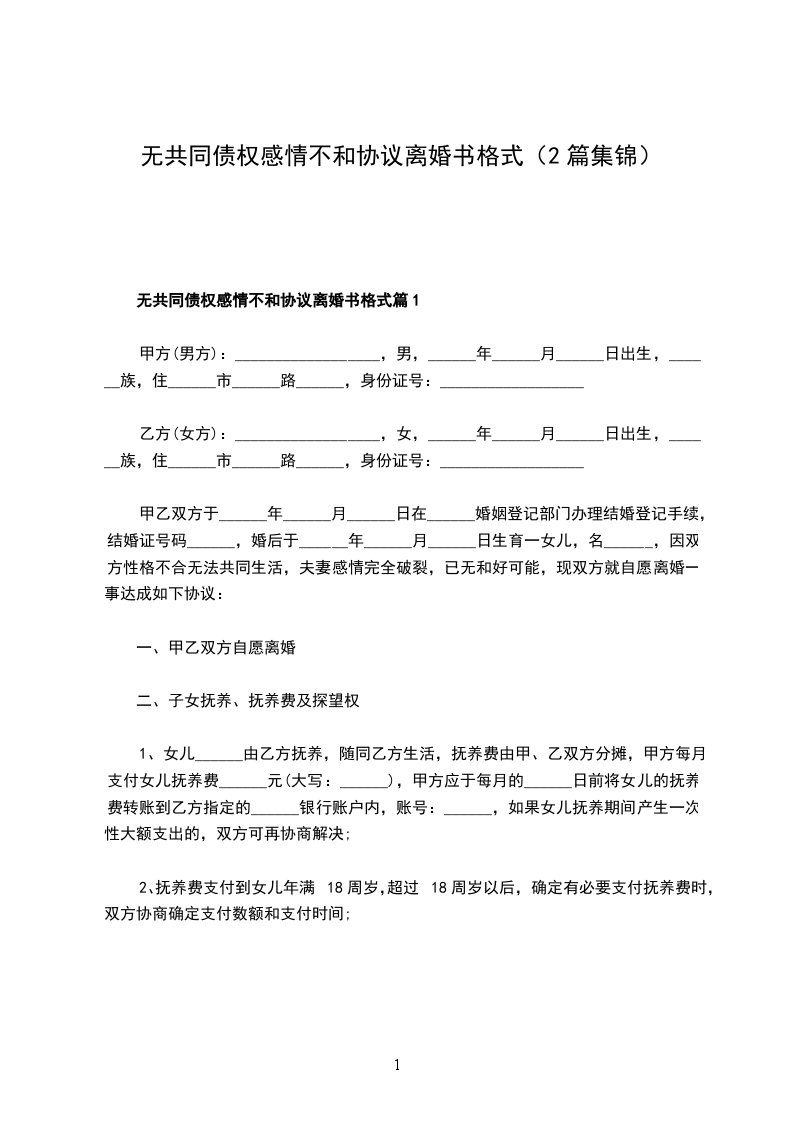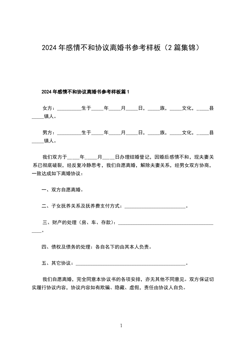乙方:(男方):_______________,男,汉族,生于_____年__月__日,住________________________________