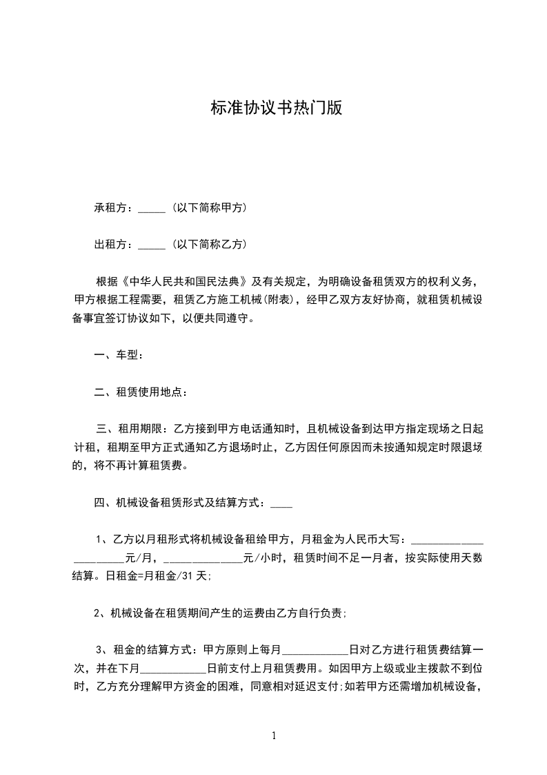 1、乙方以月租形式将机械设备租给甲方,月租金为人民币大写:______________________元/月,______________元/小时,租赁时间不足一月者,按实际使用天数结算。日租金=月租金/31天;