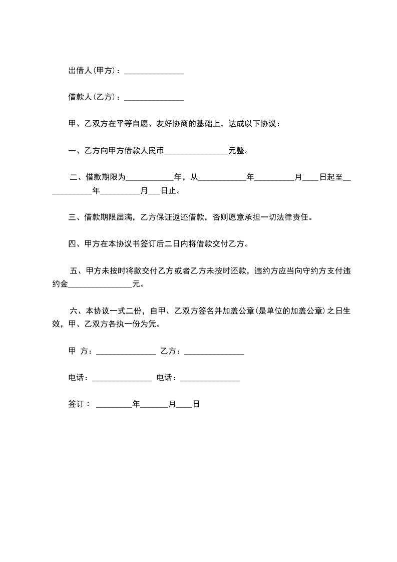 五、甲方未按时将款交付乙方或者乙方未按时还款,违约方应当向守约方支付违约金________________元。