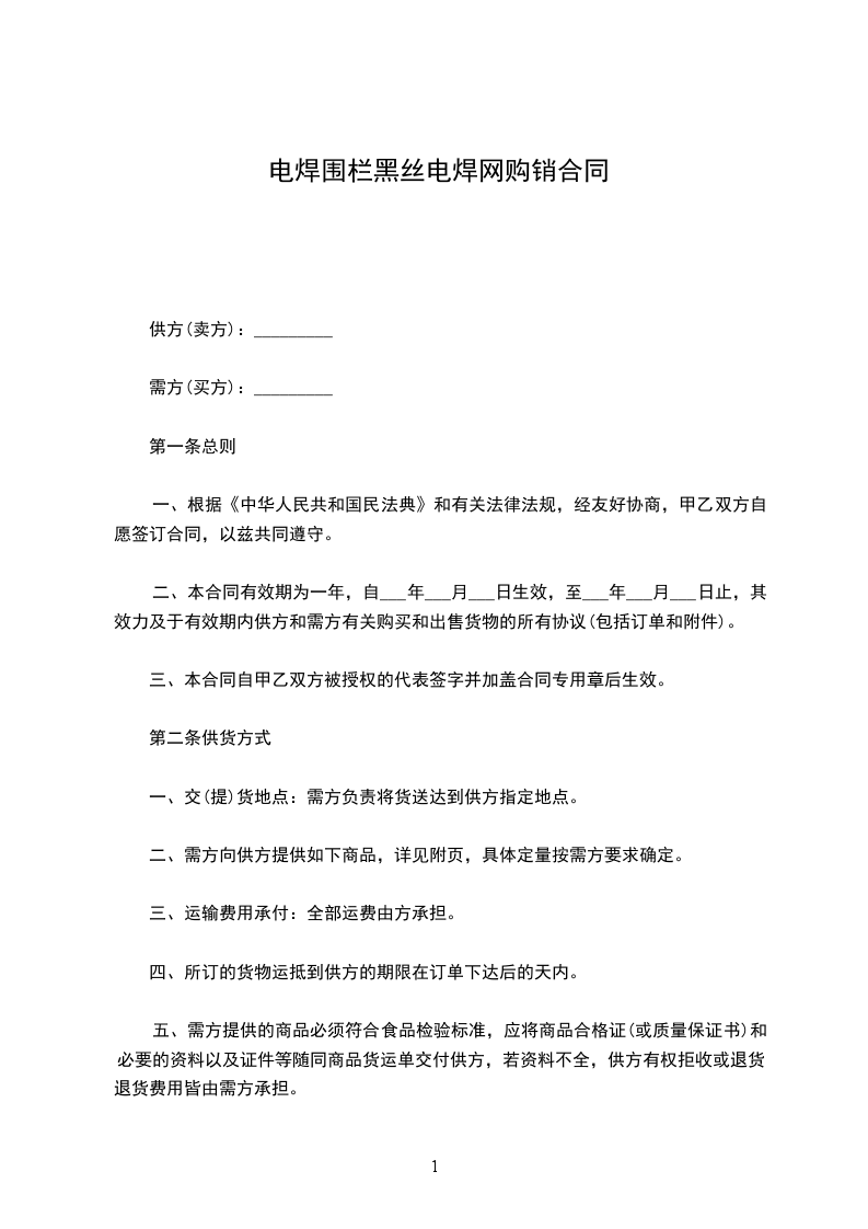 二、本合同有效期为一年,自___年___月___日生效,至___年___月___日止,其效力及于有效期内供方和需方有关购买和出售货物的所有协议(包括订单和附件)。