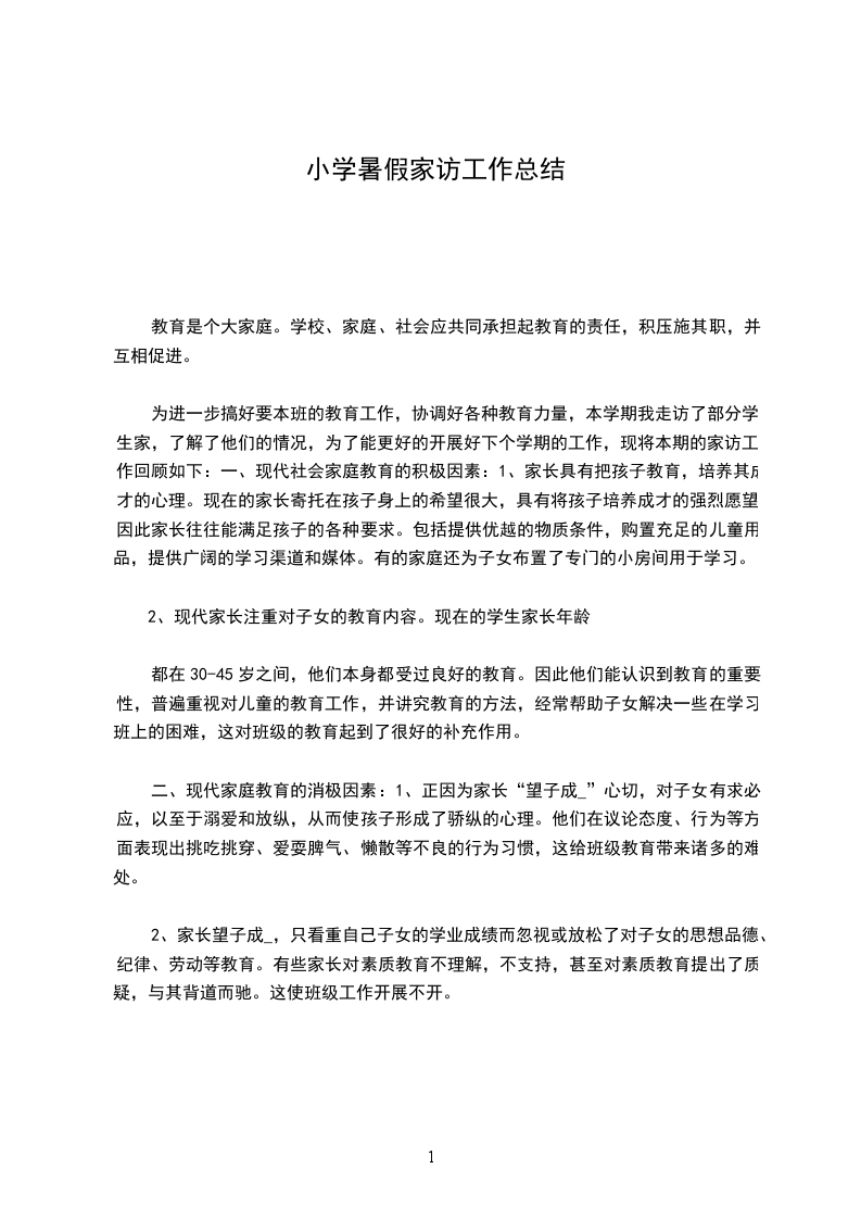 为进一步搞好要本班的教育工作,协调好各种教育力量,本学期我走访了部分学生家,了解了他们的情况,为了能更好的开展好下个学期的工作,现将本期的家访工作回顾如下:一、现代社会家庭教育的积极因素:1、家长具有把孩子教育,培养其成才的心理。现在的家长寄托在孩子身上的希望很大,具有将孩子培养成才的强烈愿望。因此家长往往能满足孩子的各种要求。包括提供优越的物质条件,购置充足的儿童用品,提供广阔的学习渠道和媒体。有的家庭还为子女布置了专门的小房间用于学习。