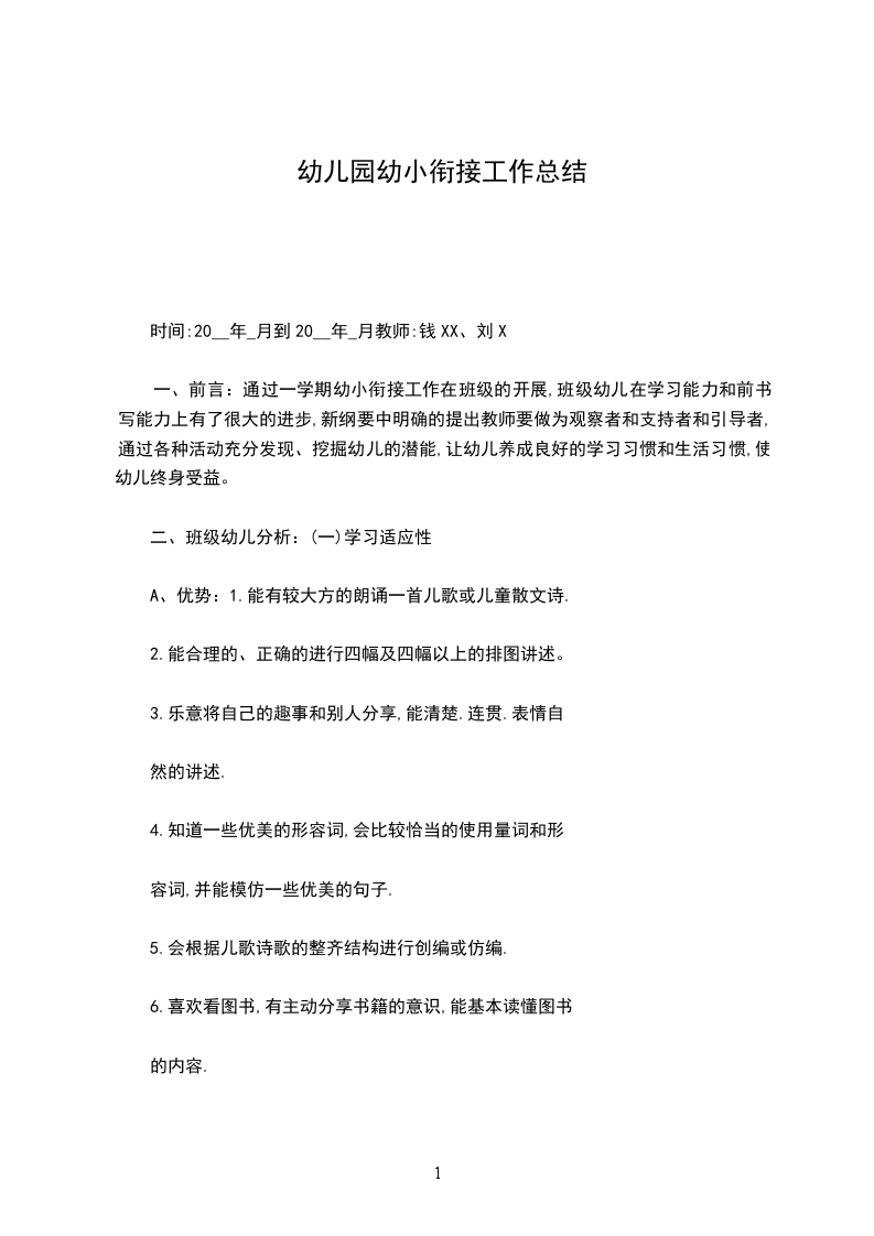 一、前言:通过一学期幼小衔接工作在班级的开展,班级幼儿在学习能力和前书写能力上有了很大的进步,新纲要中明确的提出教师要做为观察者和支持者和引导者,通过各种活动充分发现、挖掘幼儿的潜能,让幼儿养成良好的学习习惯和生活习惯,使幼儿终身受益。