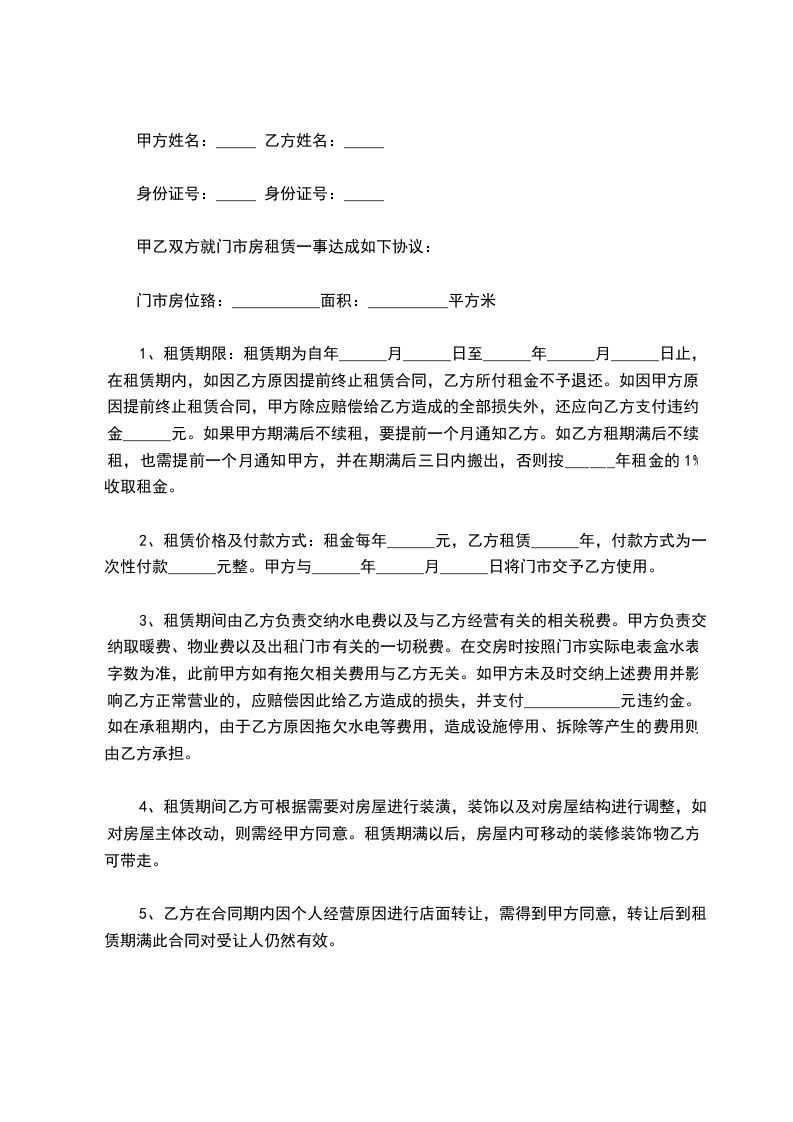 2、租赁价格及付款方式:租金每年______元,乙方租赁______年,付款方式为一次性付款______元整。甲方与______年______月______日将门市交予乙方使用。