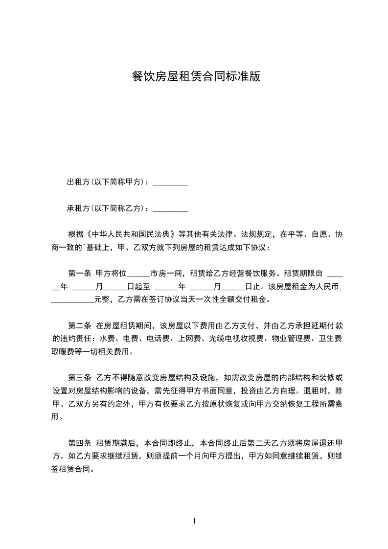 第一条 甲方将位______市房一间,租赁给乙方经营餐饮服务。租赁期限自 ______年 ______月______日起至 ______年 ______月______日止。该房屋租金为人民币____________元整,乙方需在签订协议当天一次性全额交付租金。