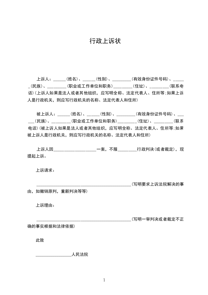 上诉人:______(姓名)、______(性别)、_________(有效身份证件号码)、______(民族)、_________(职业或工作单位和职务)_________(住址)、_________(联系电话)(上诉人如果是法人或者其他组织,应写明全称、法定代表人、住所等;如果上诉人是行政机关,则应写行政机关的名称、法定代表人和住所)