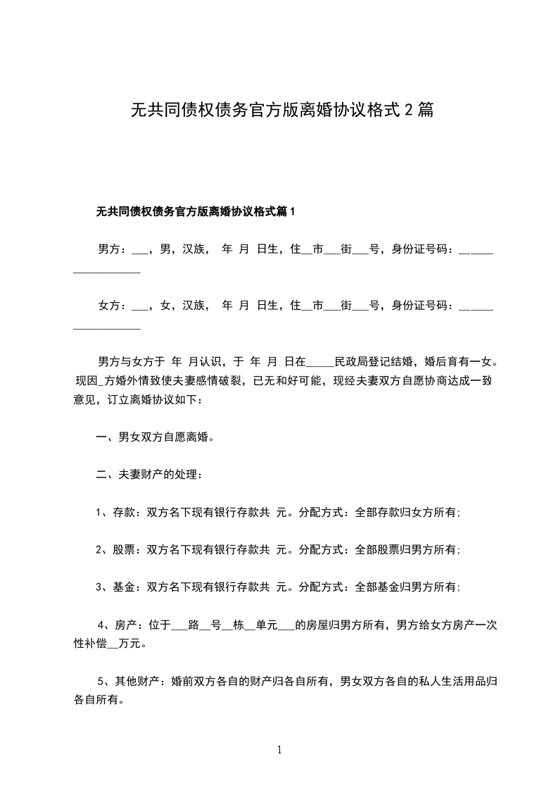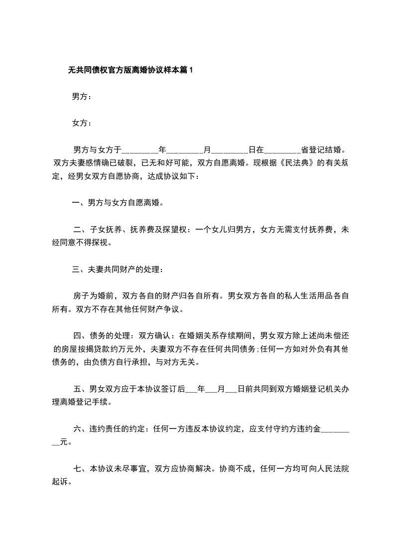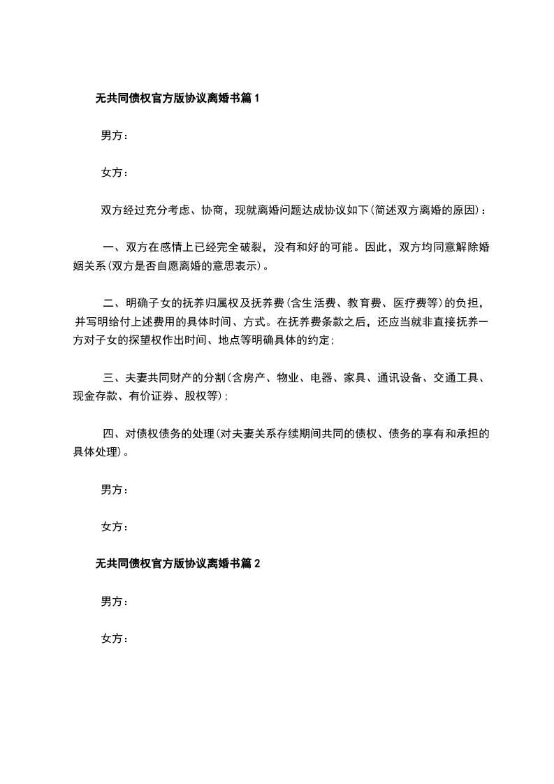 无共同的债权官方版协议离婚书篇2