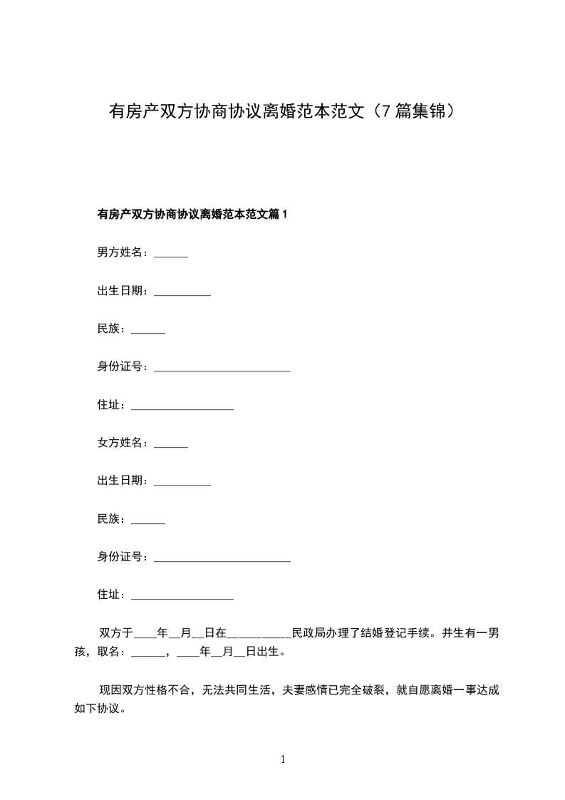 男方:_________,汉族,______年____月____日生,住____________________________,身份证号码____________________________。