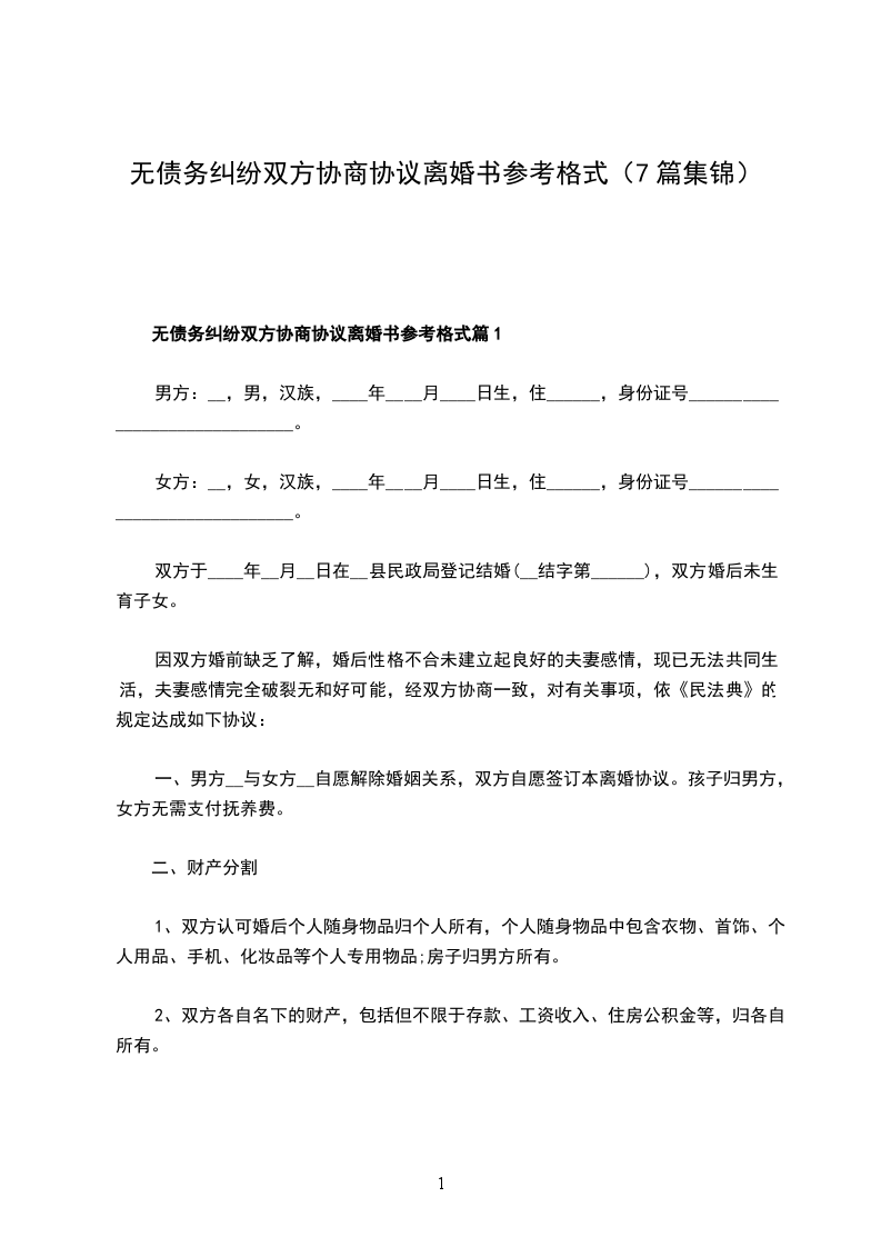 六、本协议书一式三份,男女双方各执一份,婚姻登记机关存档一份。