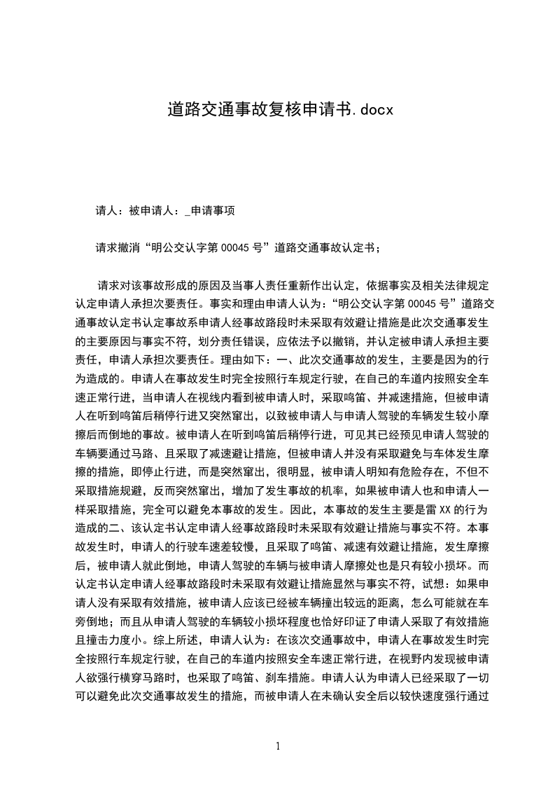综上所述,申请人认为,在该次交通事故中,申请人不存在违反《中华人民共和国道路交通安全法》、《中华人民共和国道路交通安全法实施条例》的违法行为,特向公安机关有关部门提出申请,请求上级公安机关依据相关案件事实及法律规定,撤销_________公安交通管理局_________队作出的道路交通事故认定书_________公交认字【_________】第_________号,依据事实及相关法律规定认定被申请人承担全部责任,认定申请人无责任。