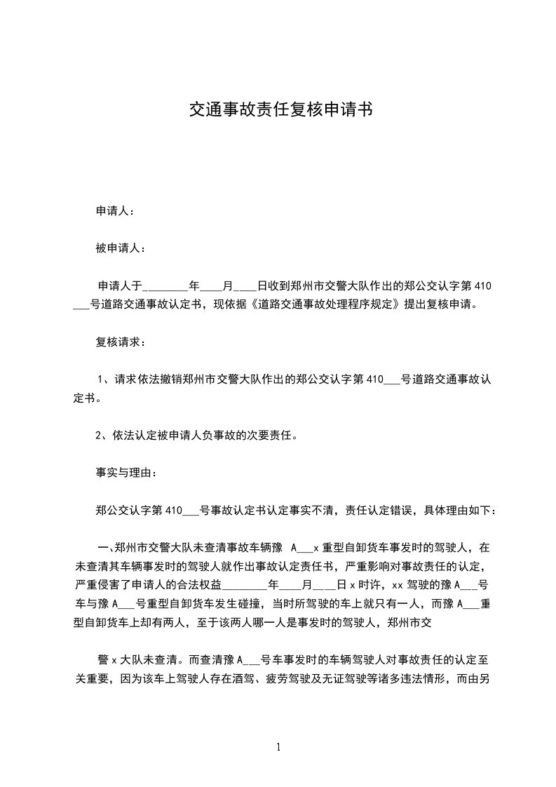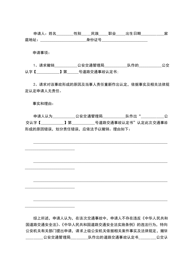 1、请求撤销____________公安交通管理局____________队作的____________公交认字【____________】第______号道路交通事故认定书;