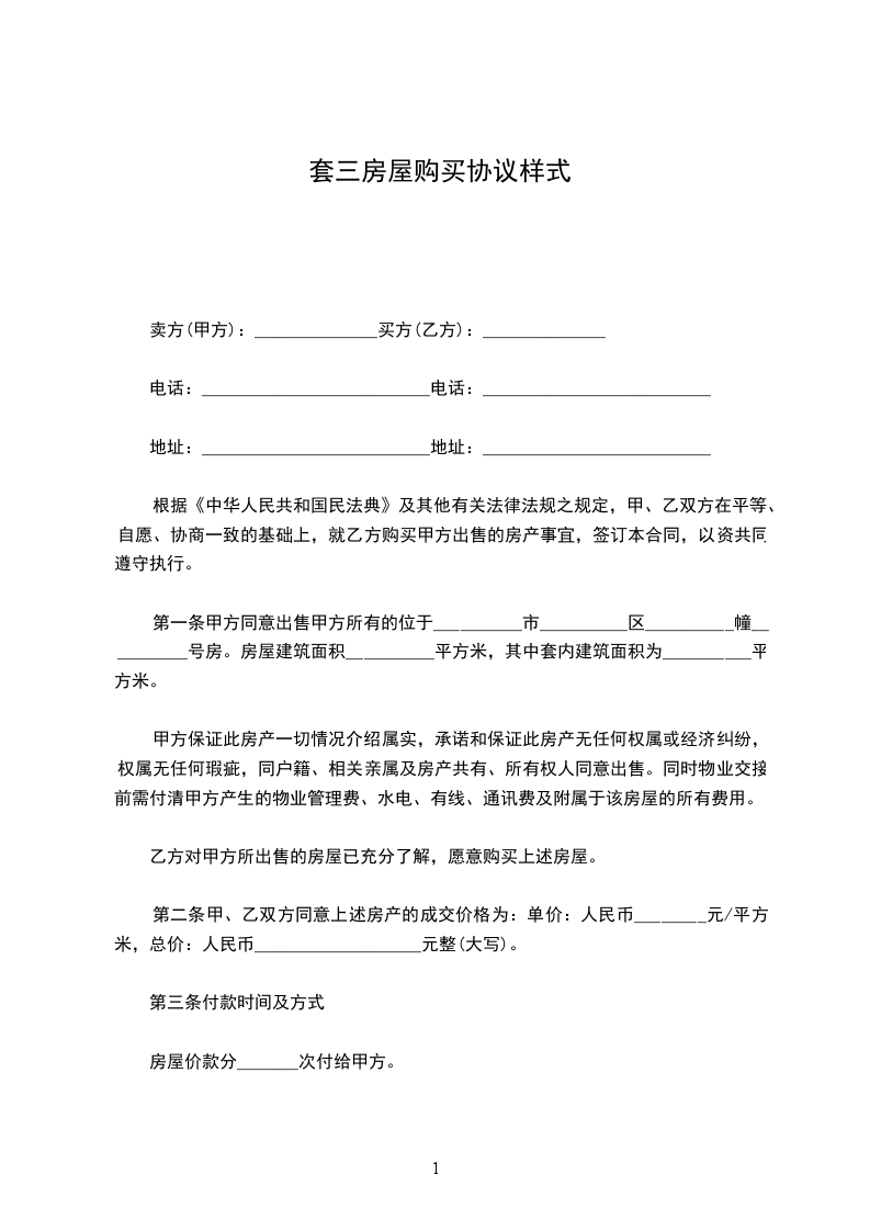 套三房屋购买协议精品版