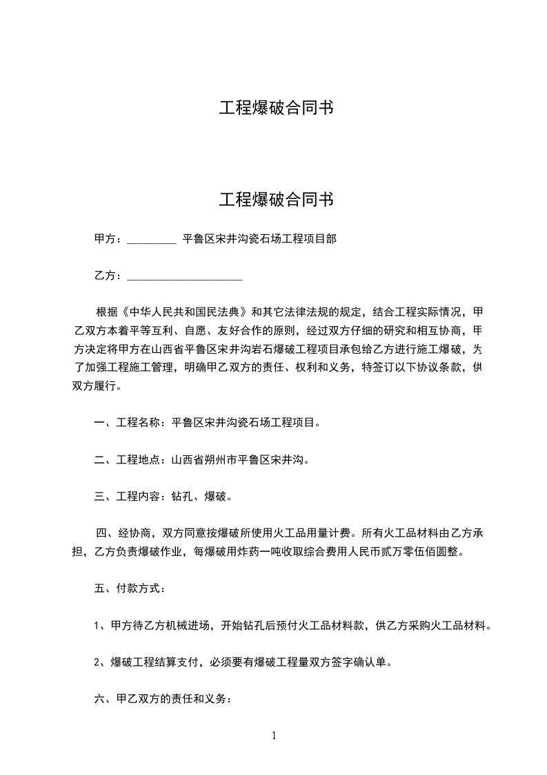 根据《中华人民共和国民法典》和其它法律法规的规定,结合工程实际情况,甲乙双方本着平等互利、自愿、友好合作的原则,经过双方仔细的研究和相互协商,甲方决定将甲方在山西省平鲁区宋井沟岩石爆破工程项目承包给乙方进行施工爆破,为了加强工程施工管理,明确甲乙双方的责任、权利和义务,特签订以下协议条款,供双方履行。