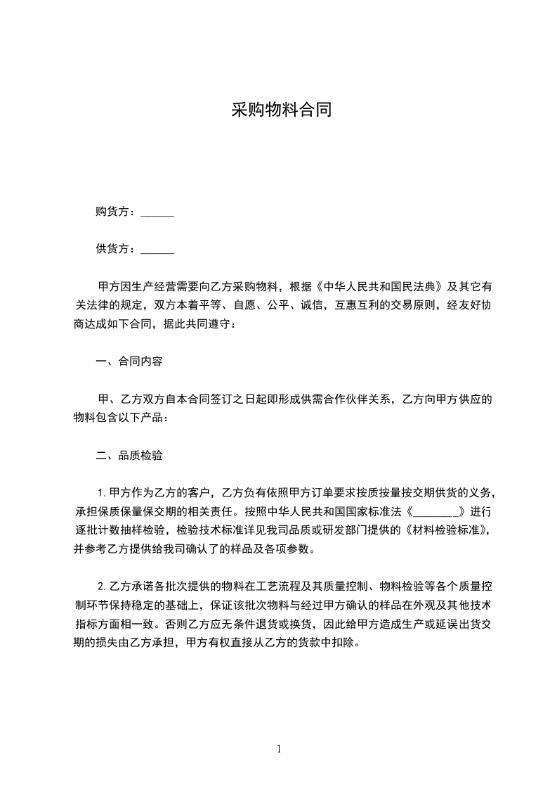 1、检验标准:乙方提供的产品应符合本合同第三条约定,乙方应随货同发必要文件,如:发货物资清单、出厂质量检验合格证书、化验单、出厂证等。